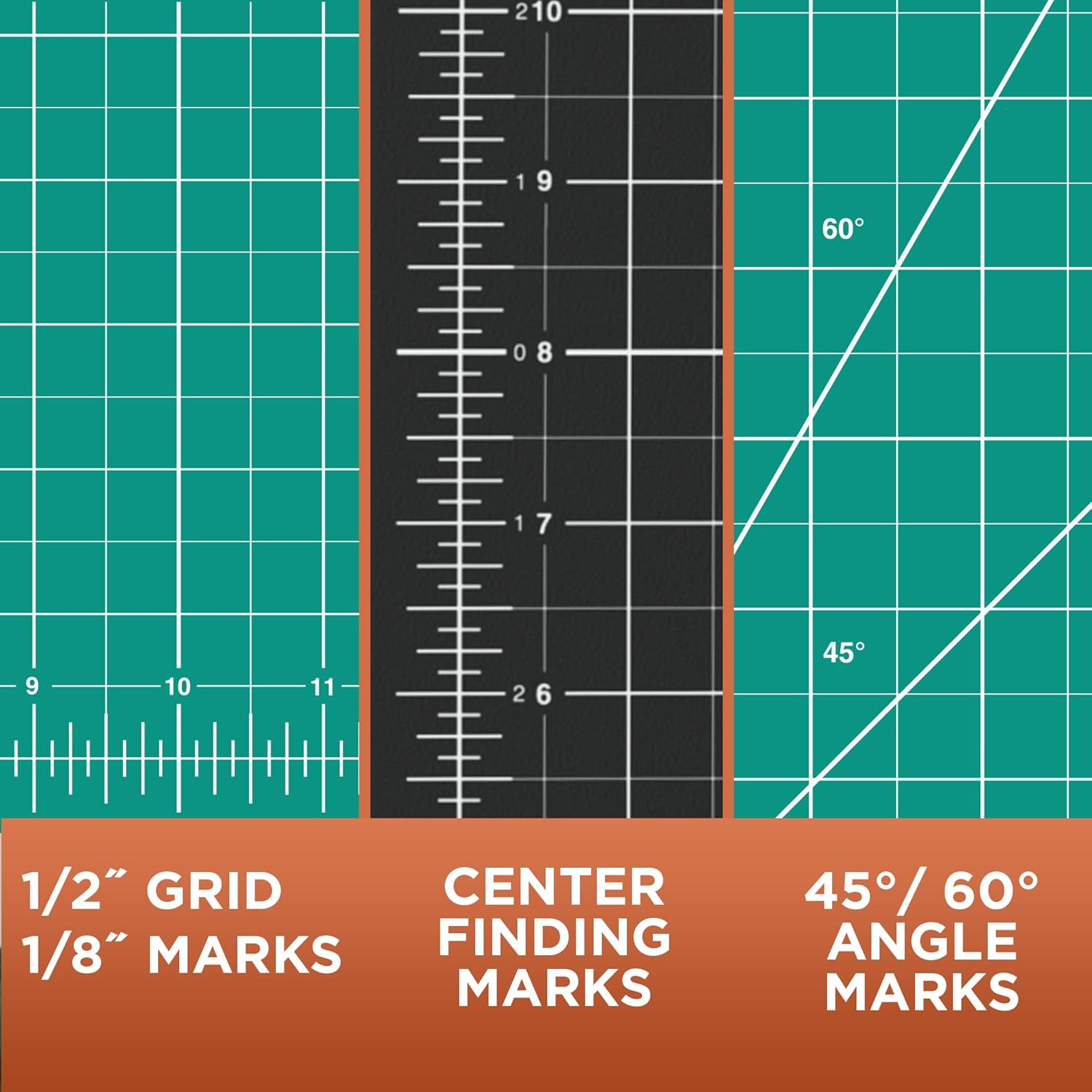 - Printed grid pattern includes guidelines for 45 and 60 degree angles and 0.5 inch grid lines. Find the perfect center on any project with zero centering lines. All 4 edges are fully numbered and graduated with 0.125 inch hash marks that extend beyond the zero base line for convenience. Mat sizes 24 x 36 inches and above include internal horizontal and vertical graduated hash marks.