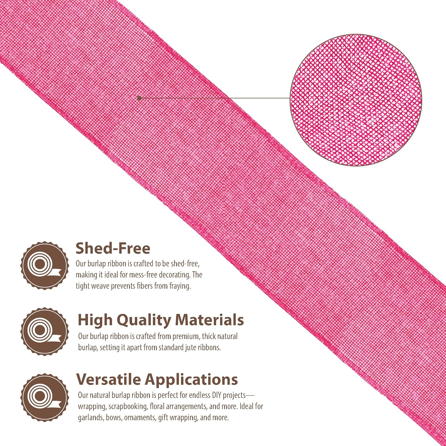 - Natural Burlap Ribbon: Compared to other jute burlap ribbons, our rustic burlaps ribbon with a fray & shed-resistant hemmed edges is made from thicker hot pink burlap fabric. The indoor & outdoor colored burlap crafts ribbon is colorfast and will not bleed.