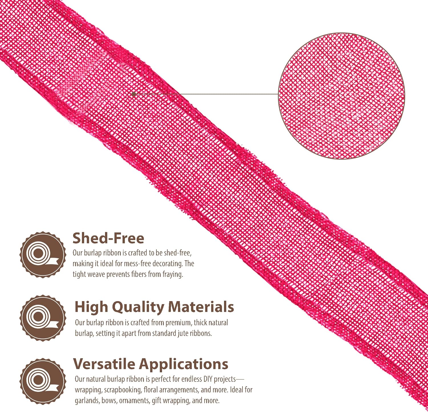 - Natural Burlap Ribbon: Compared to other jute burlap ribbons, our rustic burlaps ribbon with a fray & shed-resistant hemmed edges is made from thicker hot pink burlap fabric. The indoor & outdoor colored burlap crafts ribbon is colorfast and will not bleed.