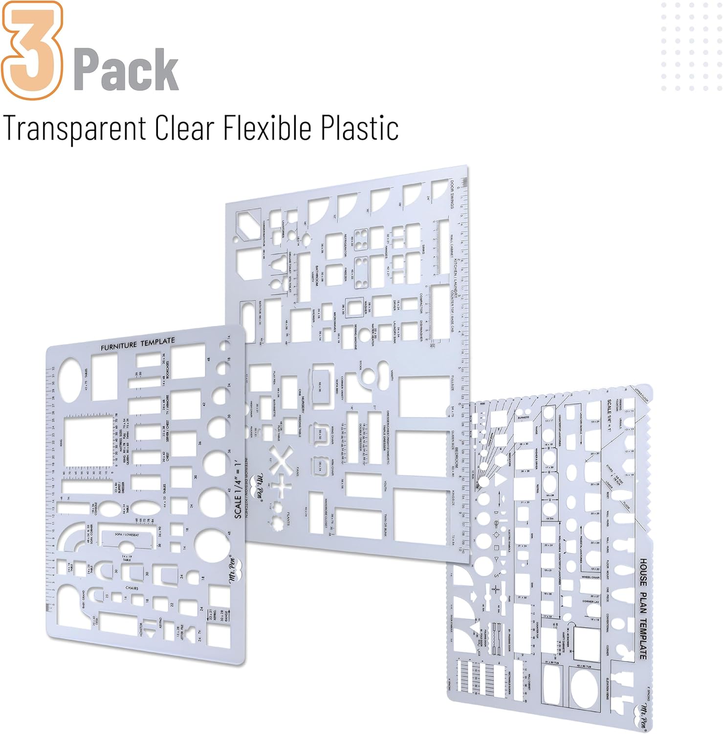 Mr. Pen- House Plan, Interior Design and Furniture Templates, Drafting Tools and Ruler Shapes for Architecture - Set of 3