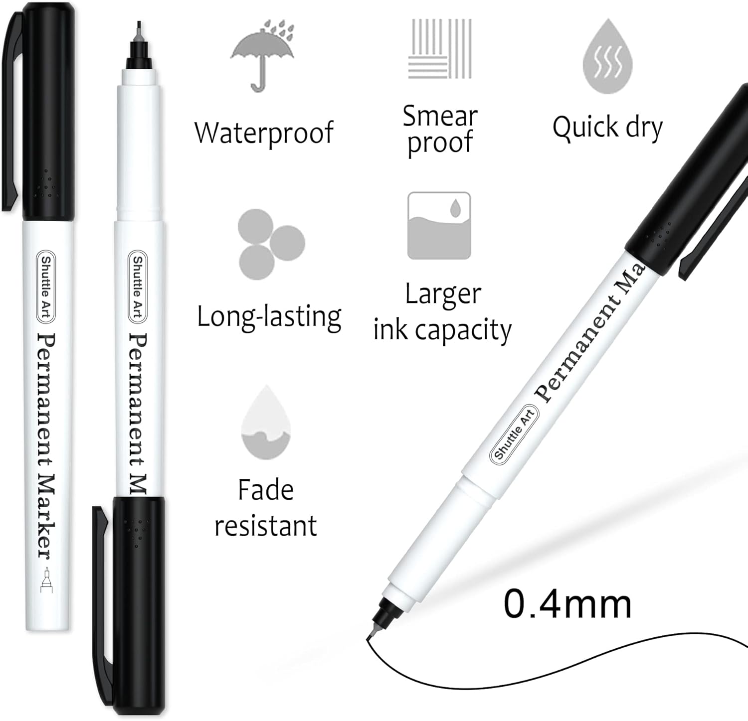 - Shuttle Art Pack of 30 premium black ultra fine point permanent markers, mark on paper, glass,ceramic,plastic, wood, rock, metal and almost all surfaces.
