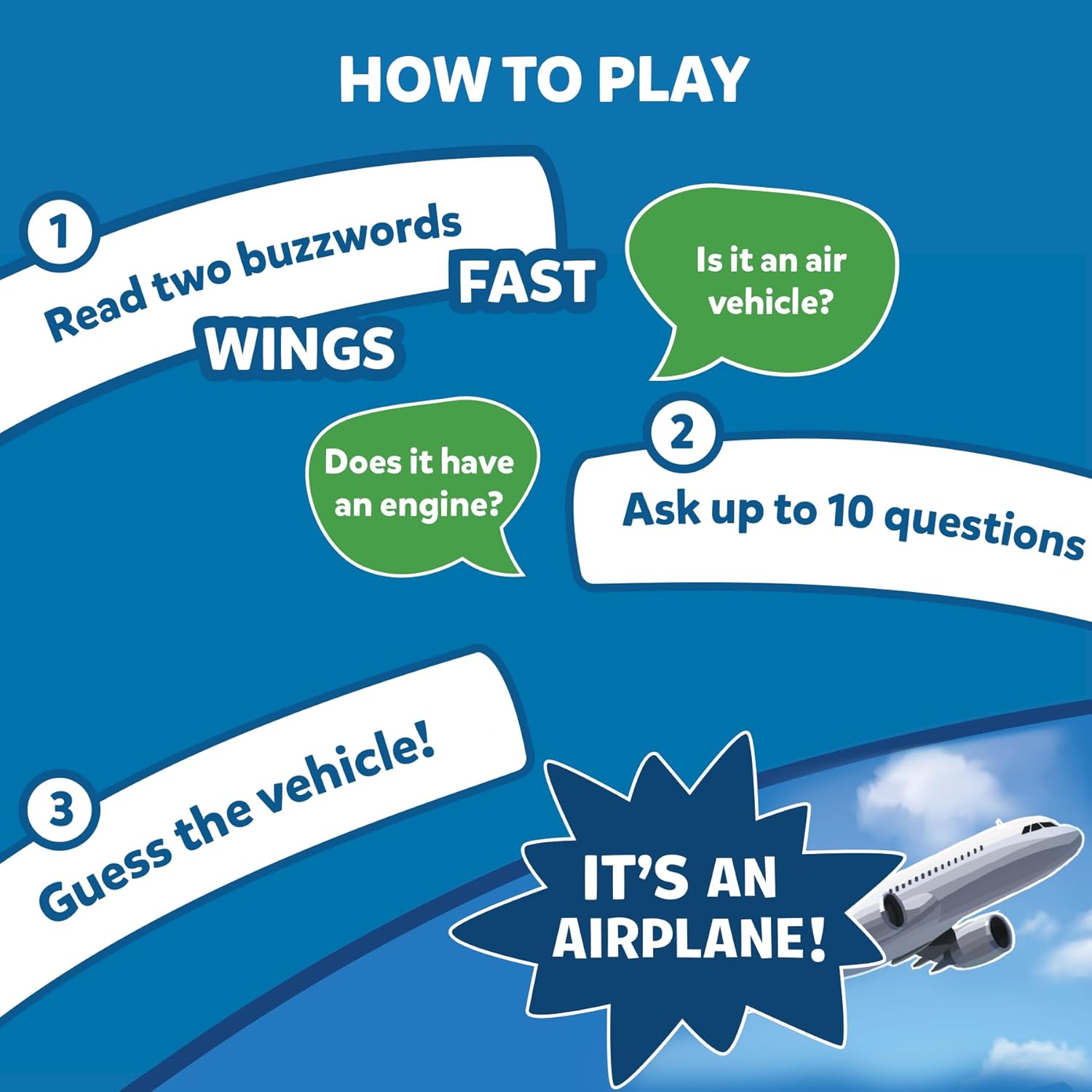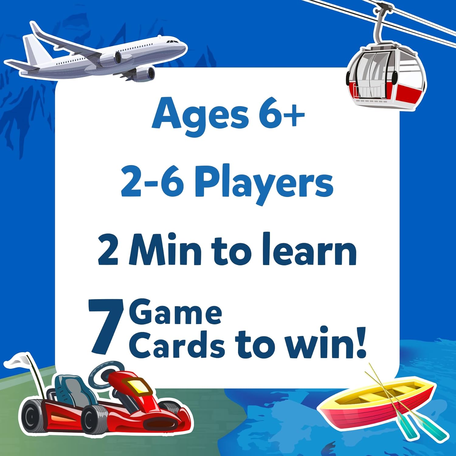 - ULTIMATE GUESSING GAME: Divide yourselves up in teams, or play one on one, ask up to 10 questions to guess the mode of transport on the Game Card! Does it have more than 2 wheels? Does it have an engine? Is it a land vehicle? Think hard, ask intelligent questions and the be the first player to win 7 Game Cards!