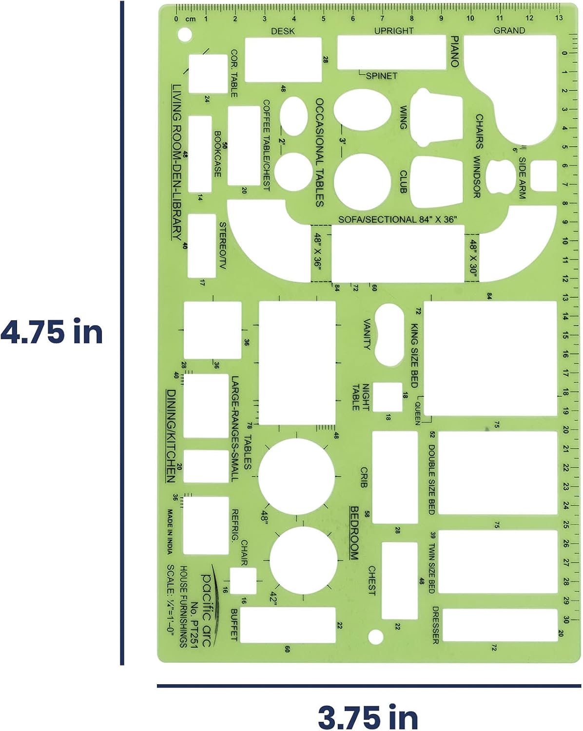 - COMPREHENSIVE TEMPLATE - This template contains all the shapes and designs for most house furnishings. This template features beds, tables, couches, chairs, entertainment systems, and other common furnishings. Ideal for house planners, architects, or just planning on where your furniture goes before you move in.