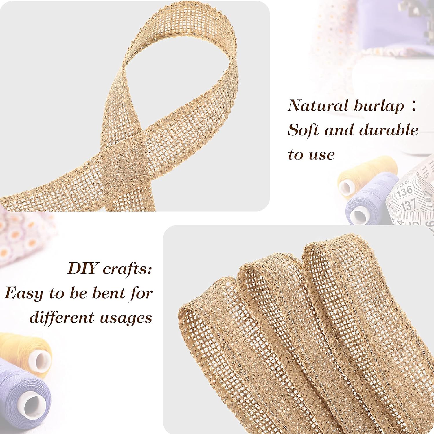 - Allow to DIY: with the exquisitely crafted finished edge burlap ribbon, you are allowed to make various handicrafts, just easily trim the ribbon into diverse shape or length according to your preference and what crafts you are going to make, to make a delicate craft bow, wreath, hair accessory and so on, fully display your creativity