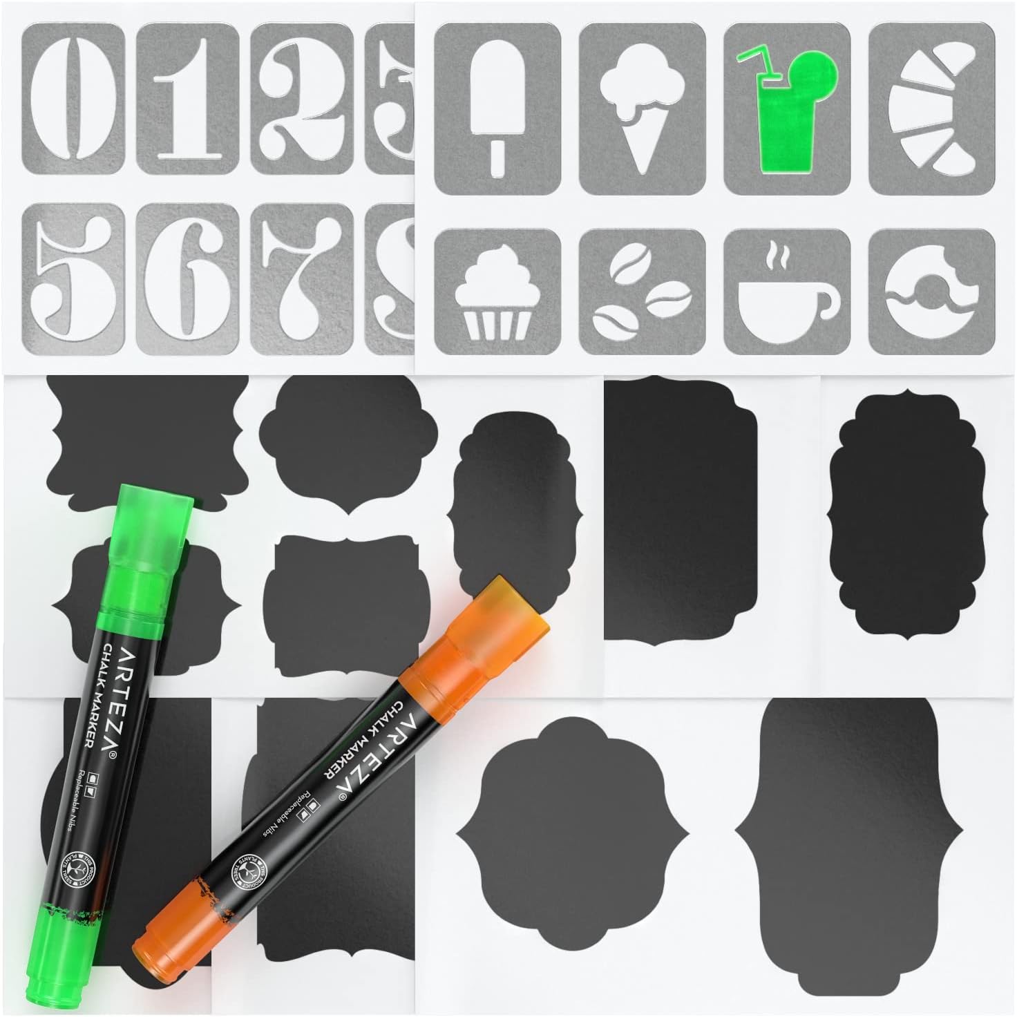 - ALL-INCLUSIVE NEON CHALK MARKERS SET: This Arteza erasable chalk markers kit includes 8 chisel tips, 1 tweezer, 50 labels, and 2 sticky stencils, providing everything you need for your vibrant art or sign project.