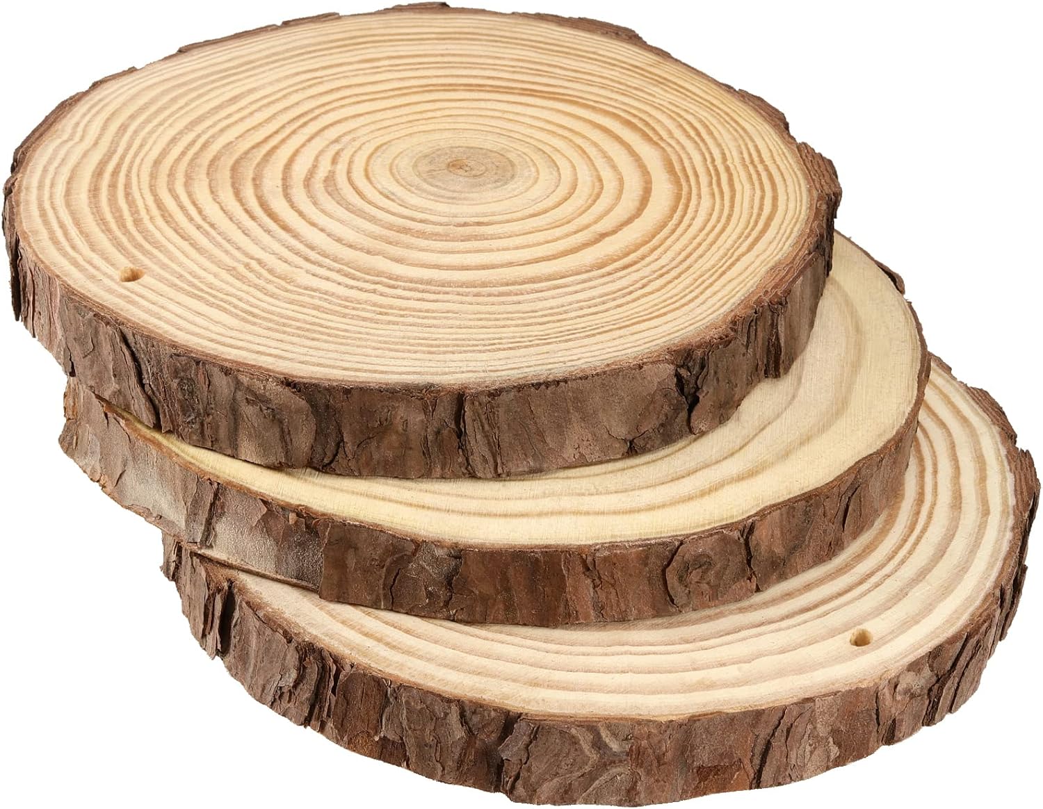- NATURAL BEAUTY - These drilled wood slices made from natural pine are really nice. They smell, feel and look great. Decent sizes and fairly similar. They're big enough for simple or detailed designs. Not too thin or too thick. They all have beautiful wood grain patterns.