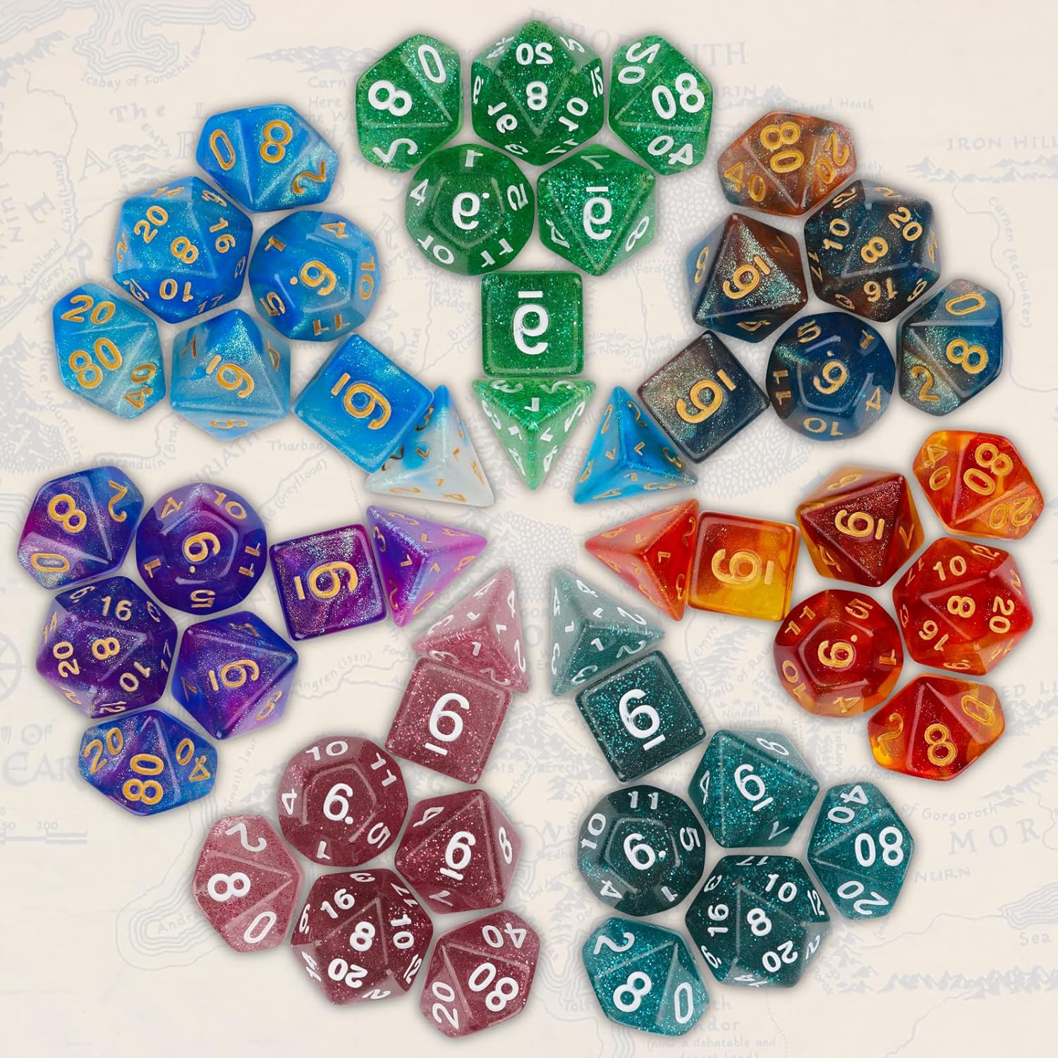 - DnD Dice Set: 7 sets of polyhedral dice, A set of 7 dice contains one of the following polyhedrons: d4, d6, d8, d10, d00, d12 and d20.