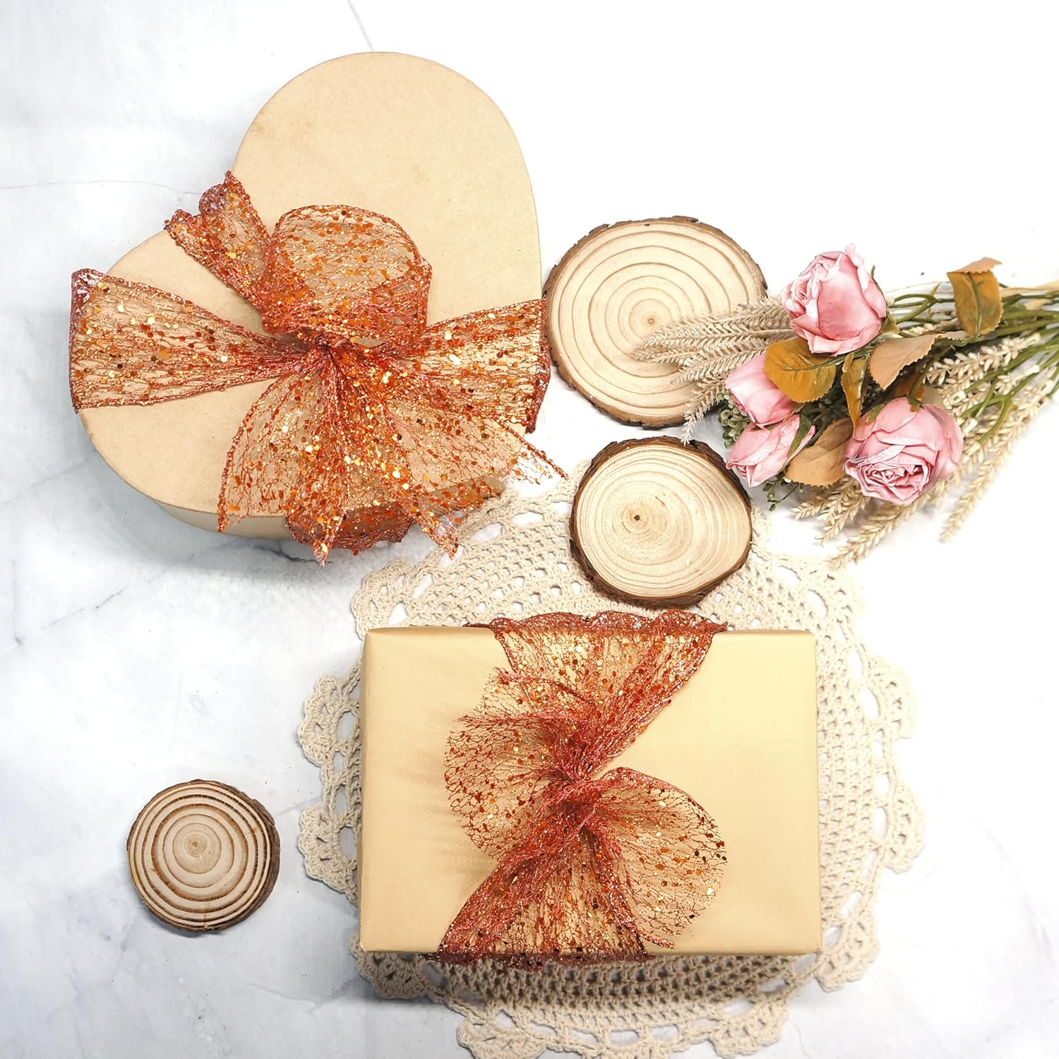 - OCCASION - Our Sparkling Glitter Mesh Wired Ribbon 2.5" Bronze Orange color are very easy to match and suitable for birthdays, party decorations, Mother's Day, Valentine's Day, Easter, Independence Day, Halloween, Christmas, New Year's gifts, Wedding decorations, Baby showers etc.