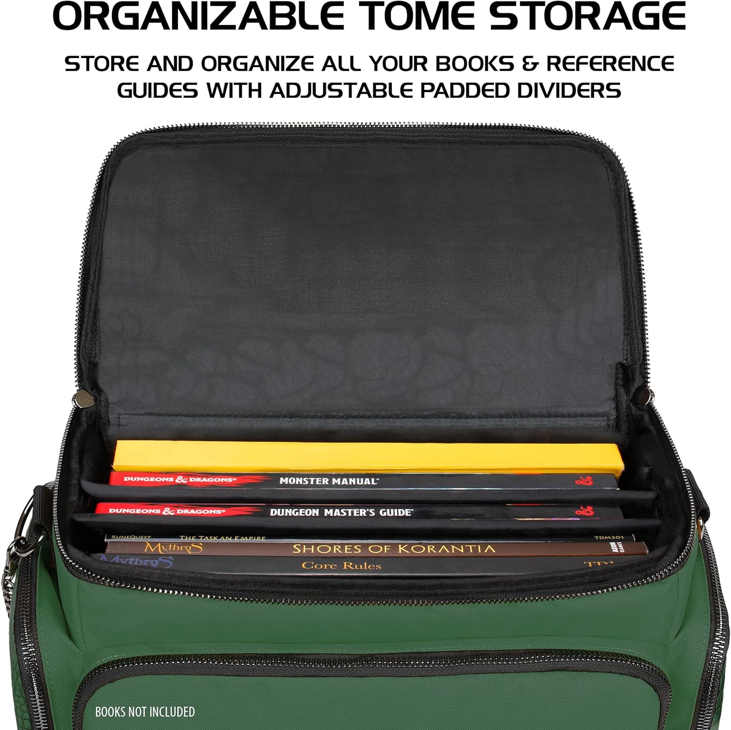 ENHANCE Collector's Edition RPG Adventurer's DnD Bag - Dragon Hide Exterior Travel RPG Bag with Tabletop Miniatures Storage Vault, Mat Holder, DnD Dice & Token Pockets, Fits 4-8 Books (Dragon Green)