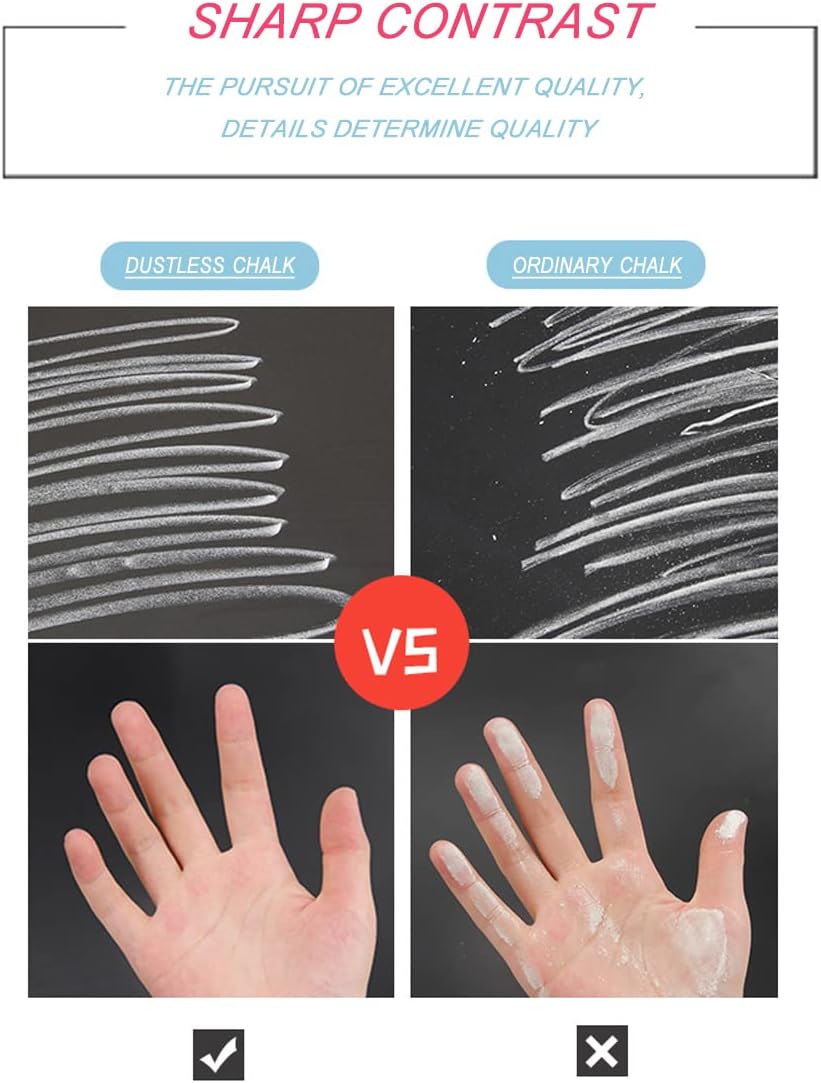 - 【MORE DURABLE】Dustless chalk is made from a high density of dustless chalk materials.One piece of clean chalk lasts about the same time as 10 pieces of regular chalk.