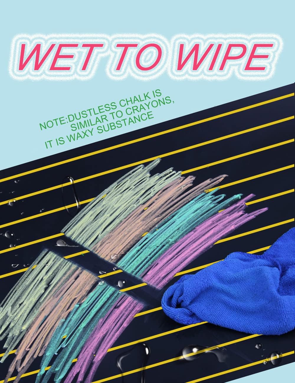 - 【WASHABLE CHALK】This no dust chalk needs to be wiped with a wet cloth or a wet eraser.Washable chalk is easy to clean, even if it gets on the clothes.