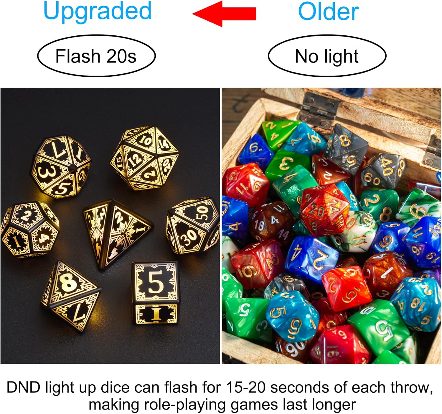- Light up Dice for Game Lovers: glowing dice built-in LED lamp beads; gorgeous appearance bring endless fun to any dice game, such as RPG, Board Games, Parties, Parent-Child Activities; Perfect for holiday parties or as a perfect gift for game players