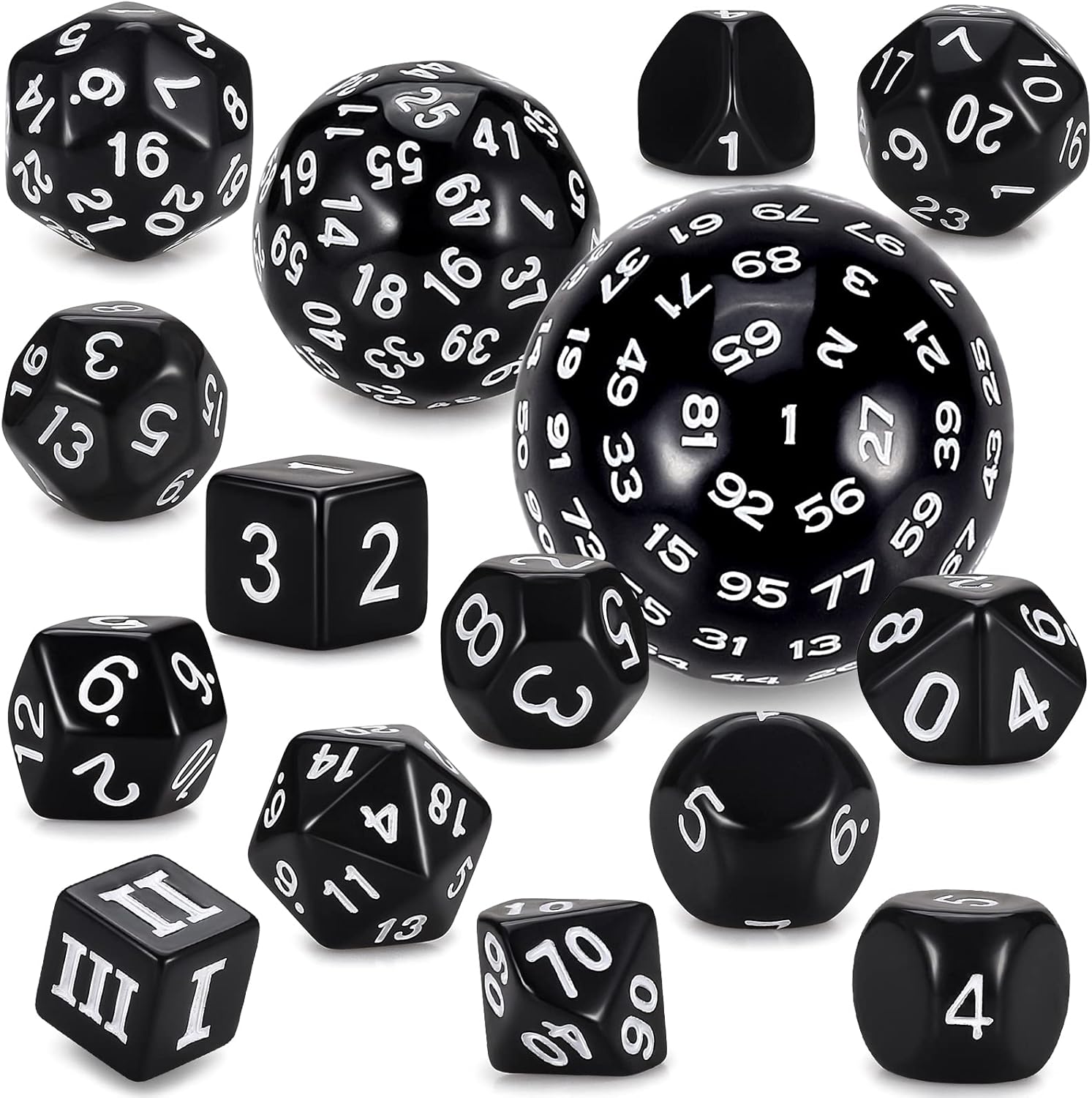 - Super dice set: DND Role Playing Dice (15pcs) from 4 sides to 100 sides, (contains D4,D5,D6,D7,D%,D8,D10,D12,D16,D20,D24,D30,D60 and D100) which can meet all your table game needs.