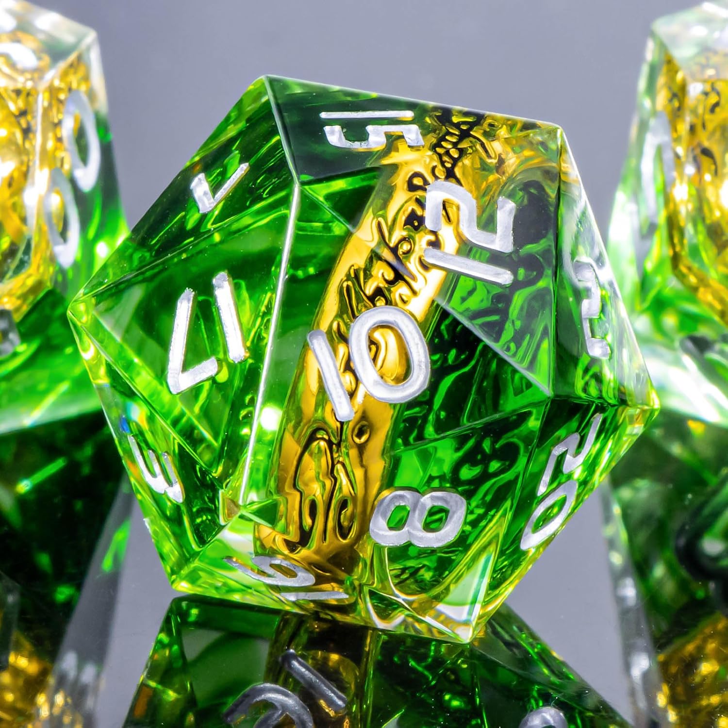 OUKELANWO Magic Lord Rings DND Dice Set with Box, 7Pcs Resin LOTR D&D Dice Set for Role Playing Game, Green Dungeons Dragons D and D Sharp Edge Dice D20 D12 D10 D8 D6 D4