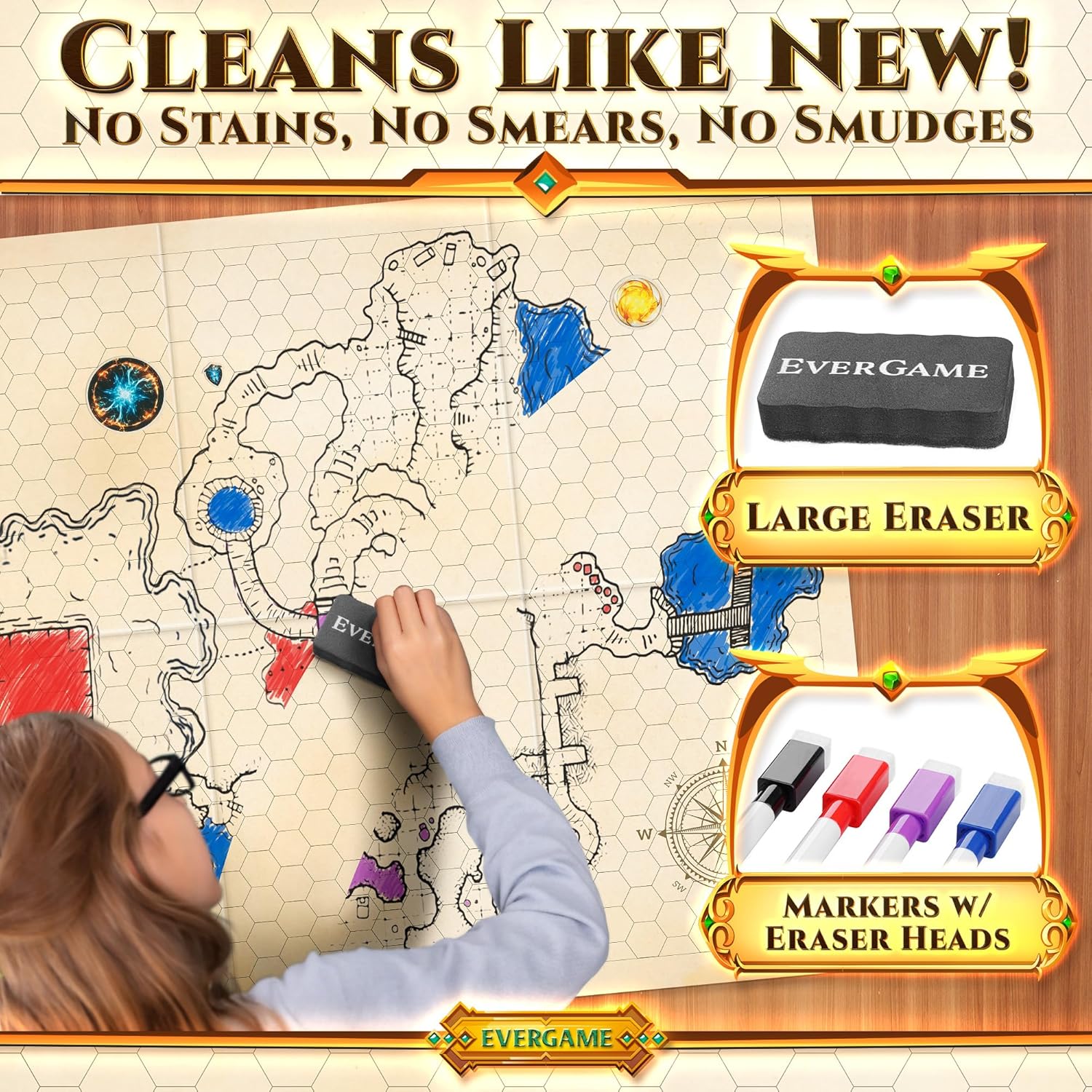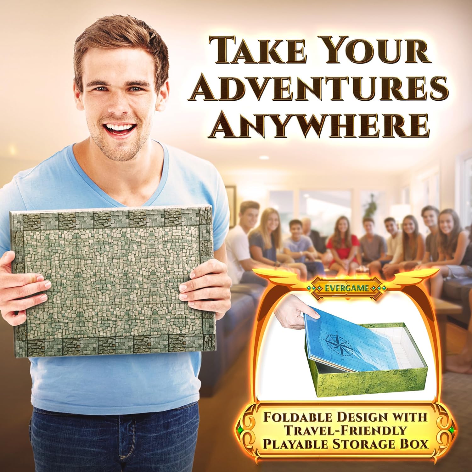 10 DND Game Mats and a lot More - Includes 6 Dungeons & Dragons Board Game Battle Maps (1" Square Grid), Huge Size 22x26-4 3D Battle Arenas, 140+ Reusable Stickers, 4 Markers & Eraser, by EverGame