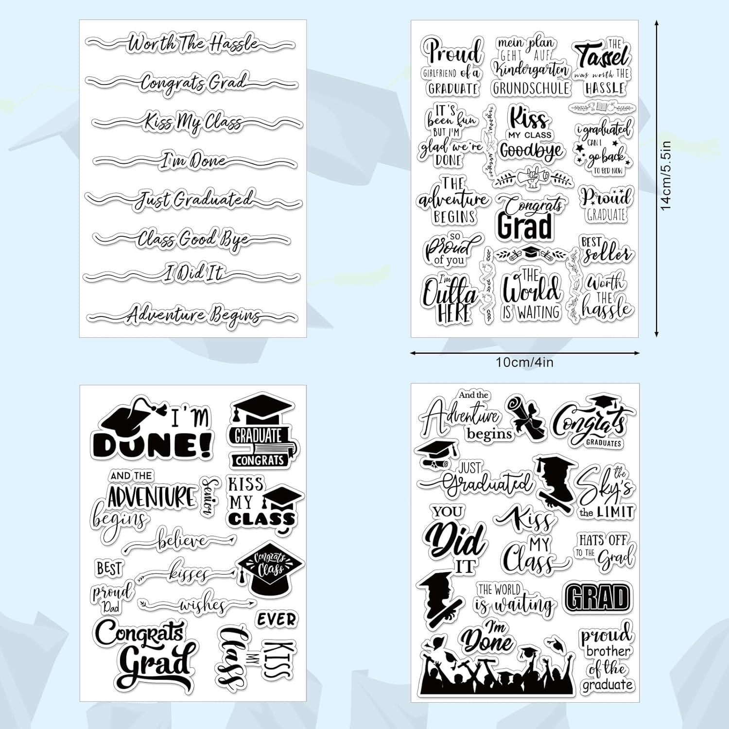 - Delicate Design- These clear stamps are designed with classic graduation theme words and patterns, such as the words of Congrats GRAD, kiss my class, etc., delicate and attractive, full of happy feelings, will be great decoration to match with various cards.