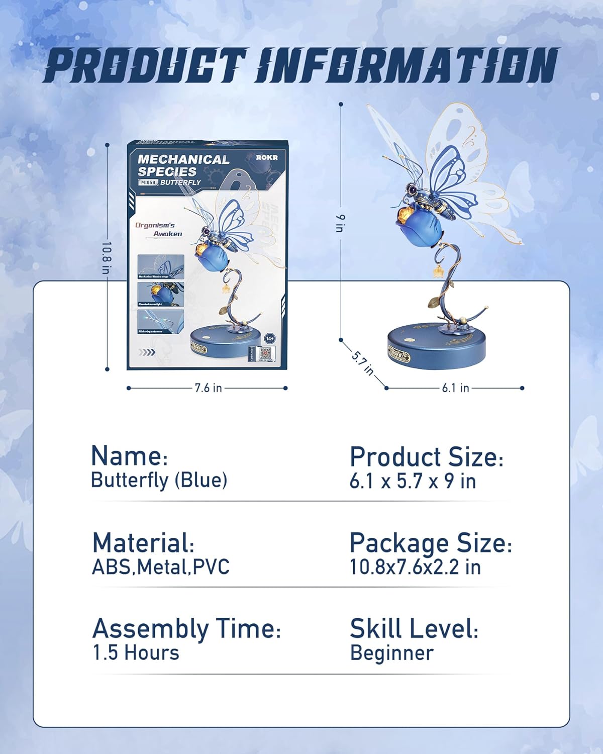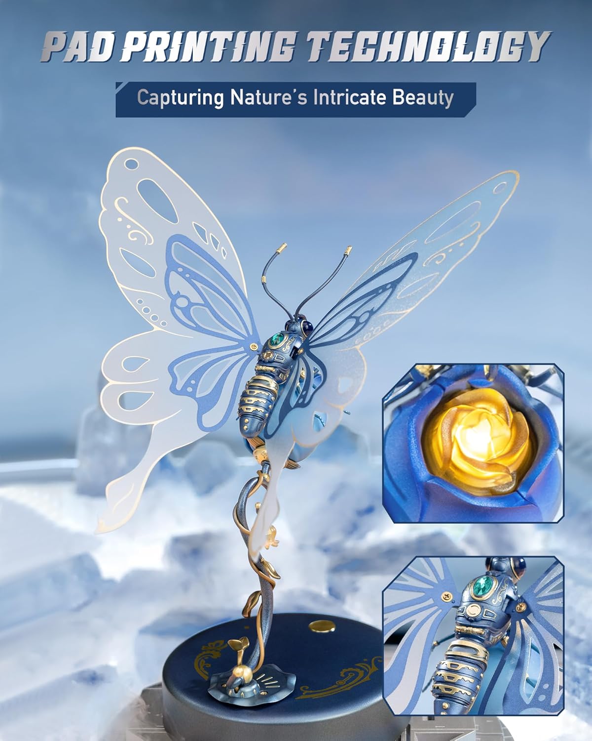 - [ROKR Metal Butterfly] The champagne-hued designs, along with a dazzling gem on its back, lend an elegant flair.Press the switch, 3 LED lights will on and the wings will keep flapping.