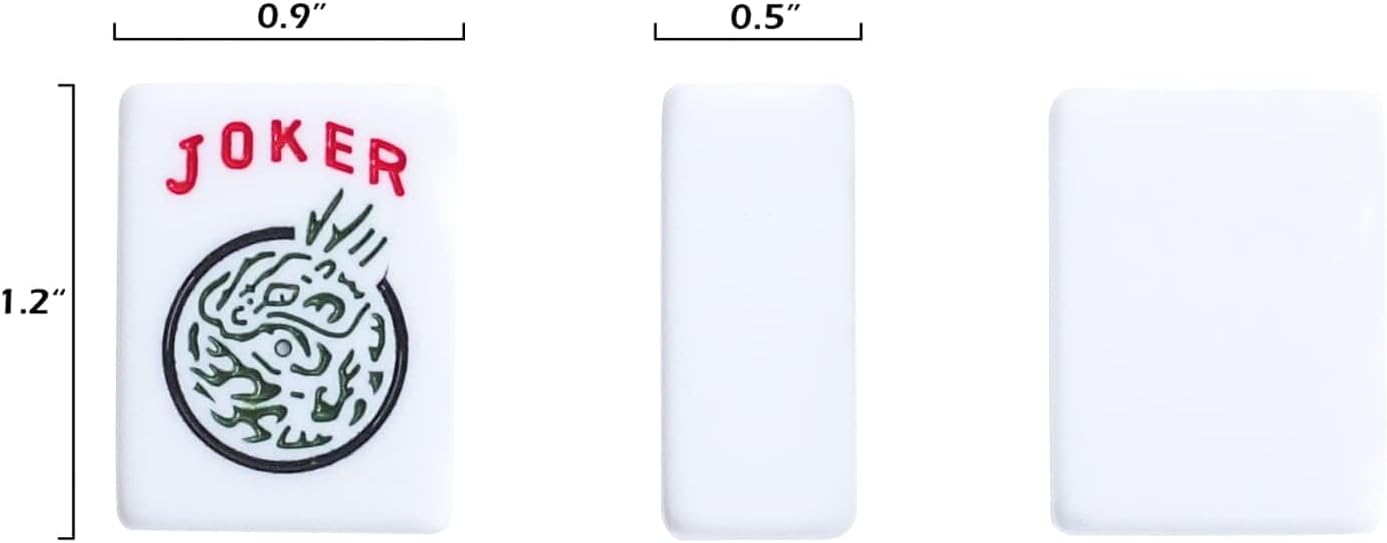 - 166 SCRATCH-RESISTANT TILES: The complete mah jongg set includes 166 quality tiles๏ผ36 Dots, 36 Bams, 36 Cracks, 12 Dragons, 16 Winds, 16 Flowers, 10 Jokers, and 4 Blank Spares). Each tile measures 1.2" ร 0.9" ร 0.5". Additionally, two tile trays with lids are provided for convenient storage.