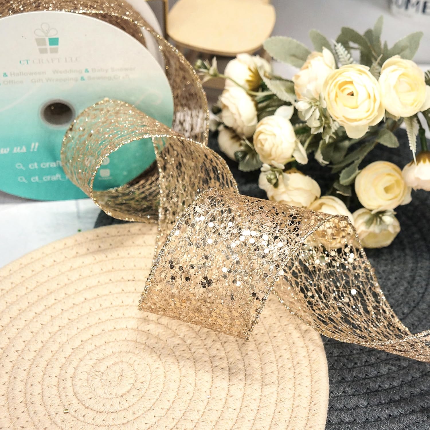 - A MUST-HAVE FOR DECORATION - Don't miss it if you're choosing a Sparkling Glitter Mesh Wired Ribbon 2.5" Champagne Gold for your decoration! Our ribbon works perfectly for decorating and adding finishing touch to your craft projects. Simple and elegant.