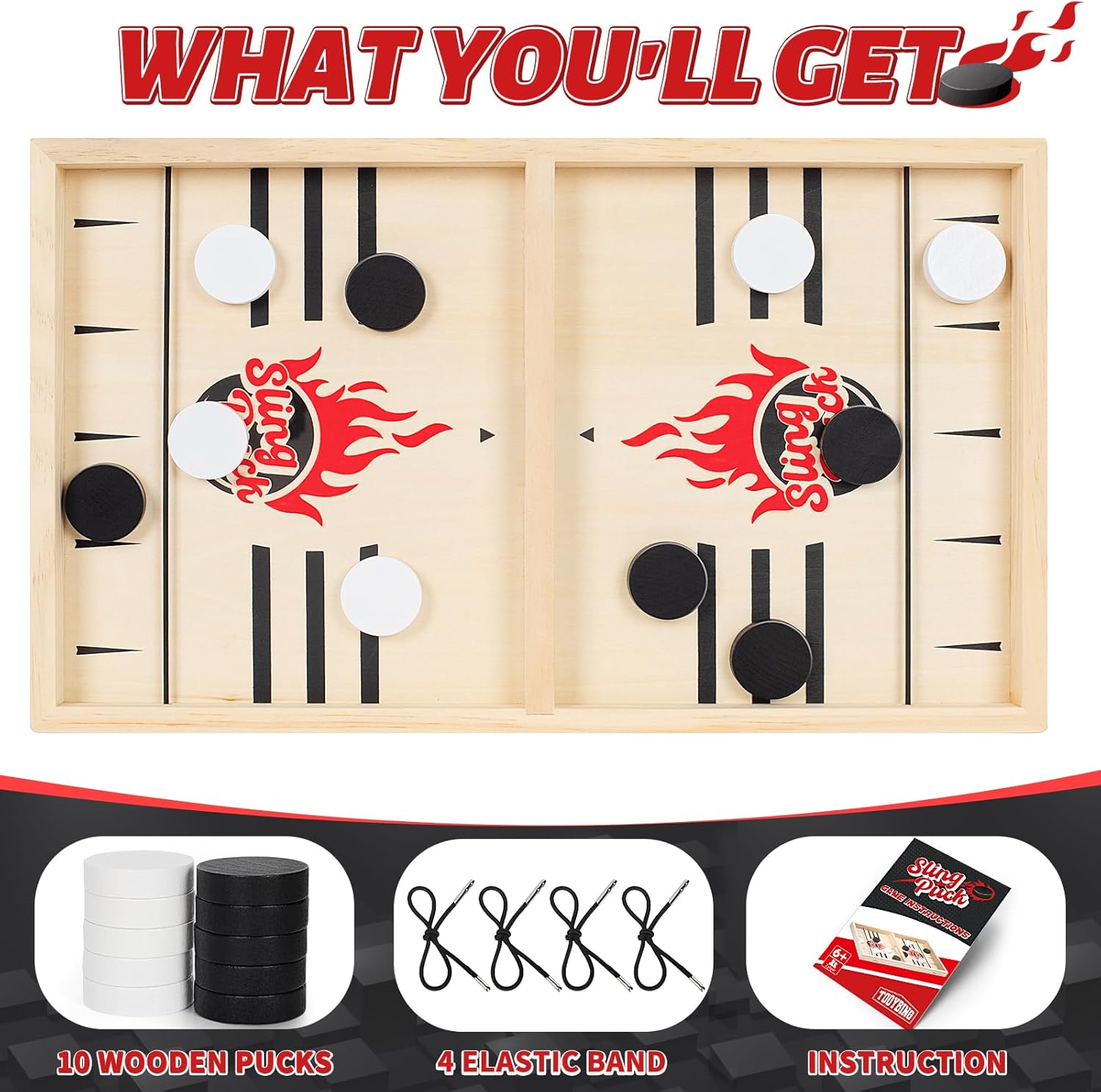 - Cool Wooden Board Games: This hockey game will bring you an exciting and fast-paced gaming experience. The set includes a board game, 10 pucks, 4 black elastics, an instruction manual and a beautiful gift box. It is not only a great gift, but also a great choice for family game night, parties or some fun competitions.Suitable for 2 player board games.