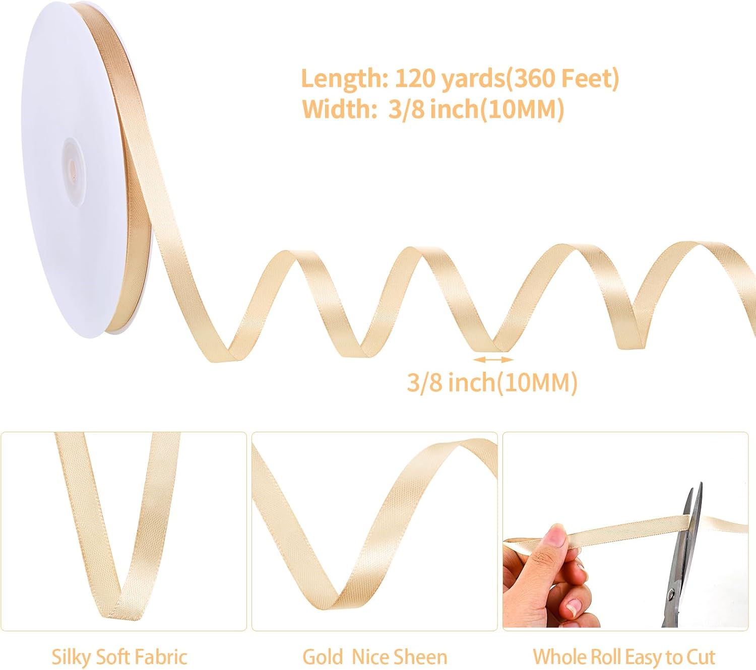 - 【Size Information】This gold ribbon is 3/8 inches wide and 120 yards long; it is enough length for you to cut it at will to meet different decorative needs, each roll come with plastic spool and protection paper on two side, so it's easy to storage