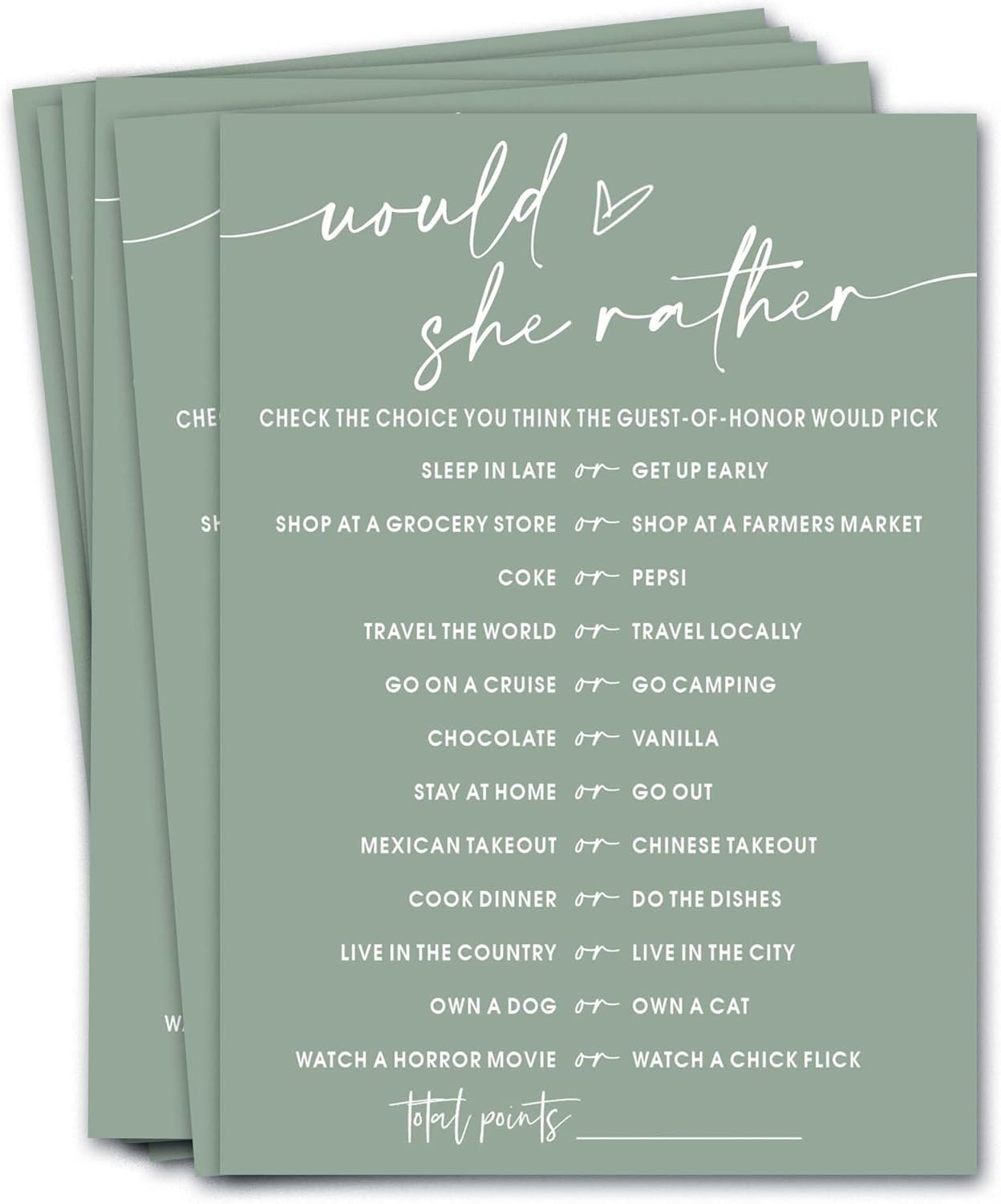 Bridal Shower Games Cards, Would She Rather Bridal Shower Game for 25 Guests, Engagement Party Wedding Games for Guests, Minimalist Green Wedding Party Supplies - C11