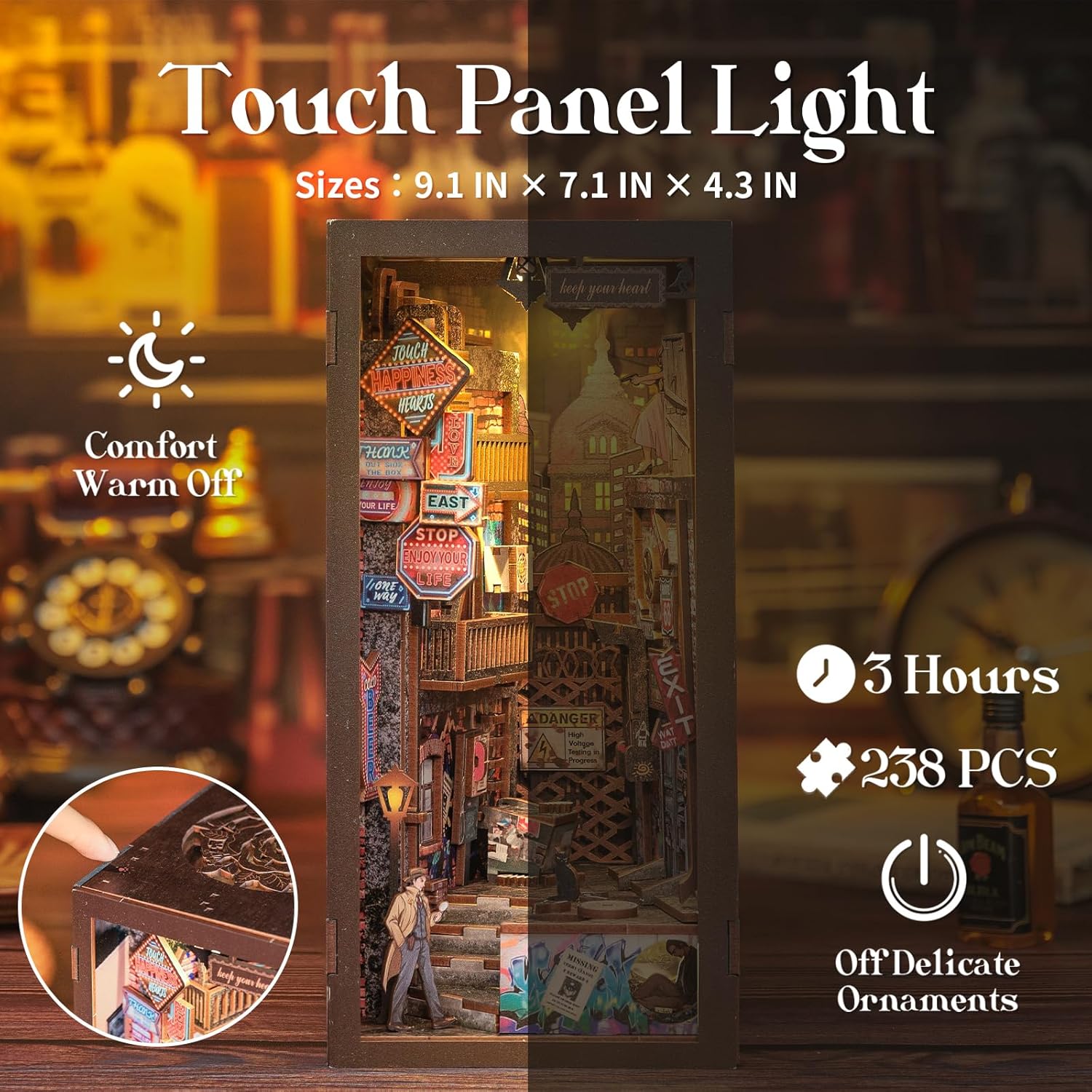 - 【DIY Book Nook Kit-Eternal Bookstore】 We've restored a corner of 1950s New York City with the Miniature Book Nook Kit, and inside the book nook kit, you'll find a 1950s bar and alleyway with a variety of neon signs. As well as skyscrapers separated by a chain link fence. Against this chaotic backdrop are “interlocking crime scenes.” Let's explore the dangerous moments together.
