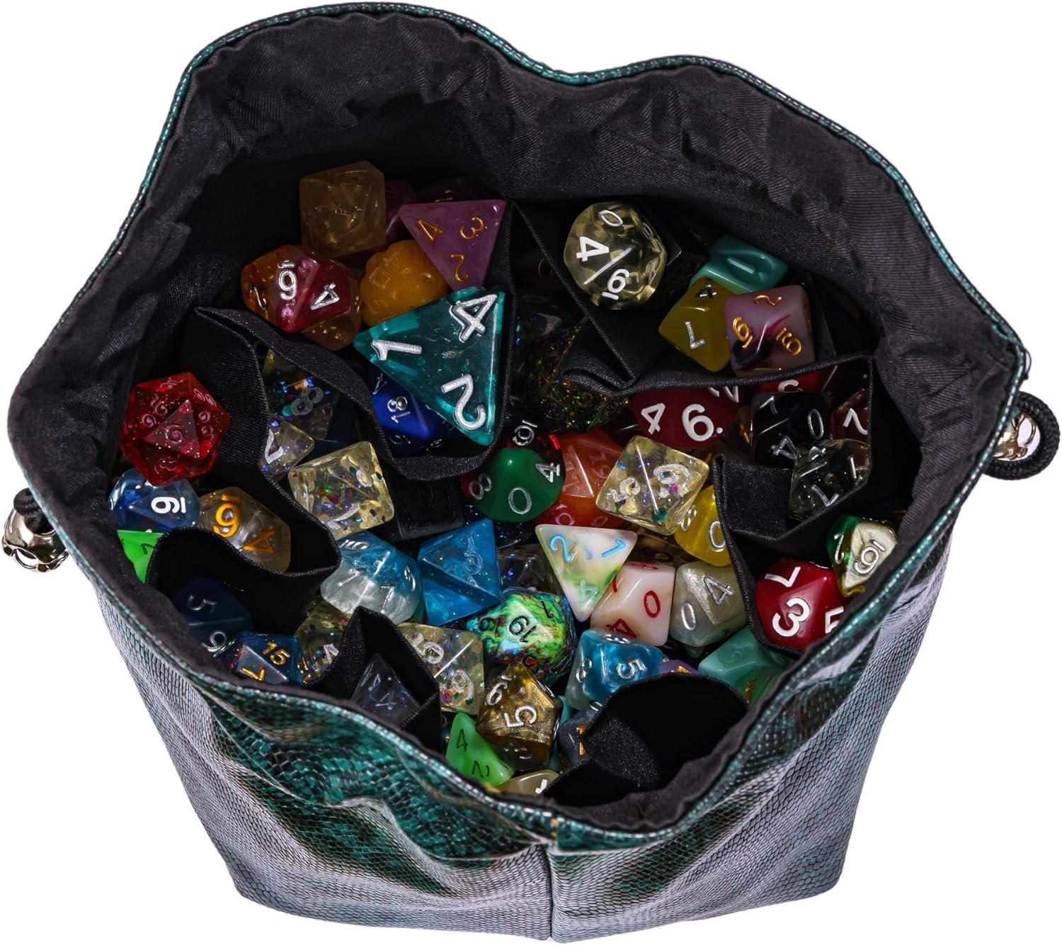 Large DND Dice Bag Leather Dice Storage Bag Dark Green D&D Drawstring Pouch with Pockets for RPG Table Games - Can Hold 200+ Polyhedral Dice