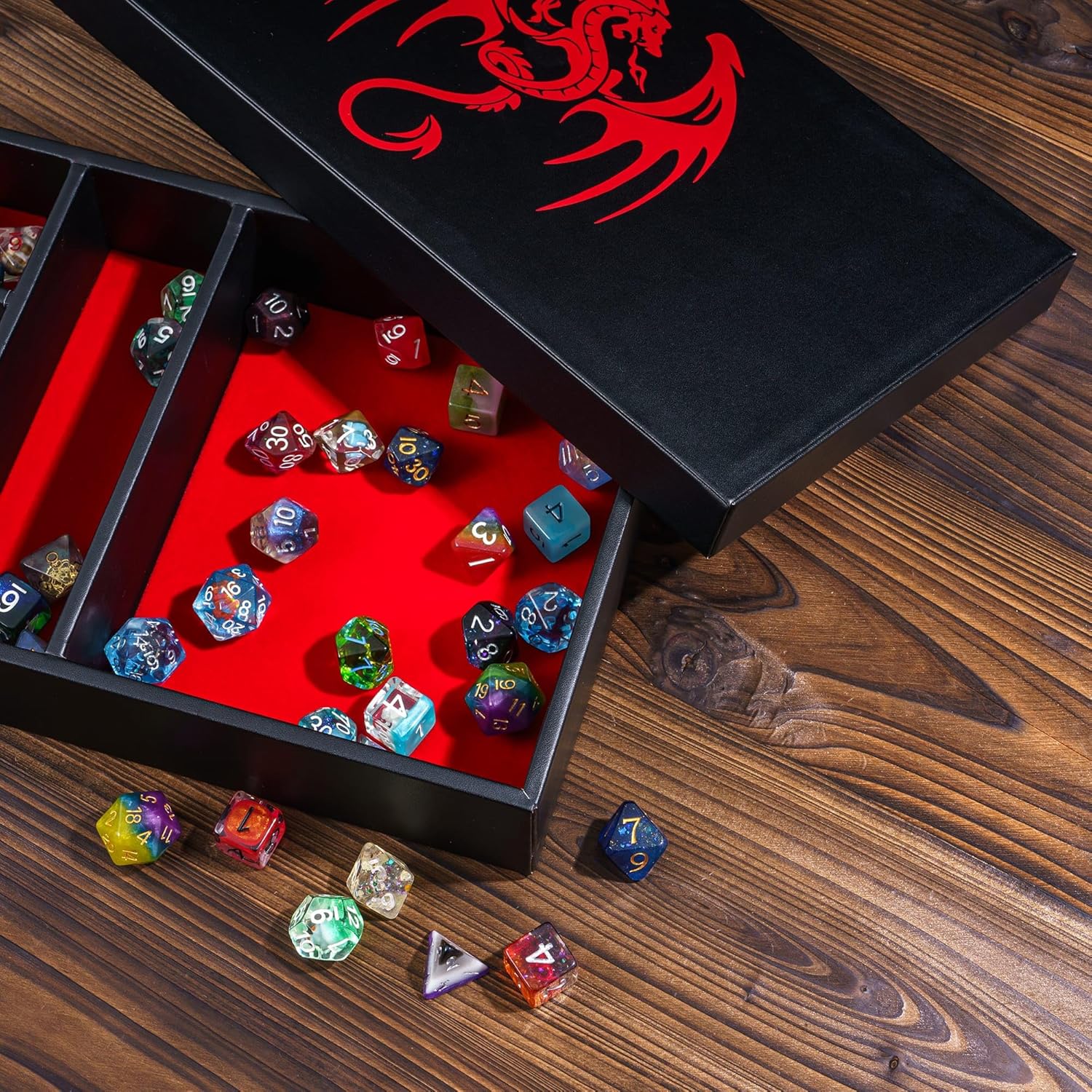 - Premium Dice Box: exquisite appearance, the lid is printed with dragon pattern and the dice tower is printed with the same pattern. This must be the perfect companion for DND rpg players. I think you need this super practical multipurpose dice storage box too.