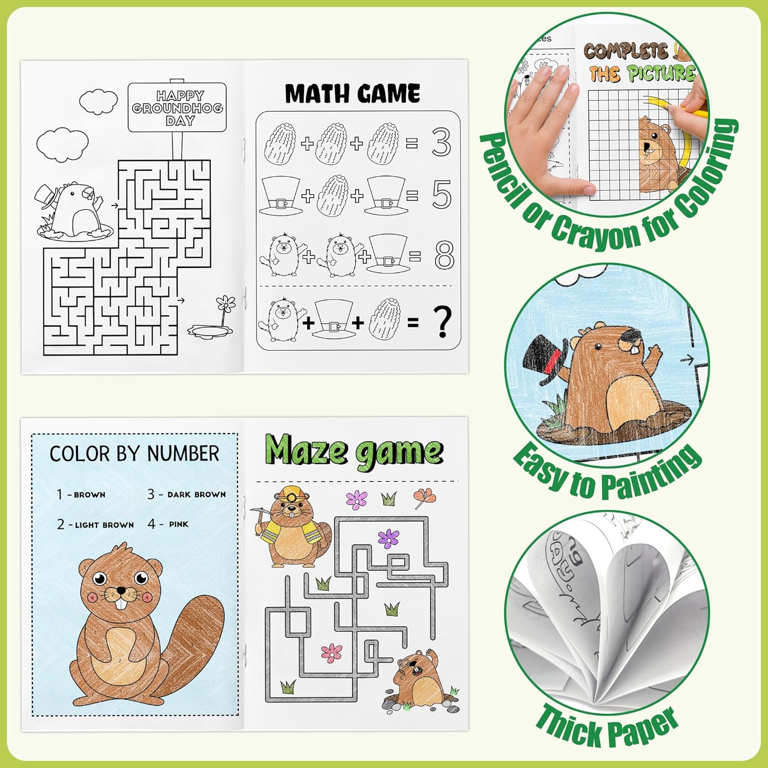 - Portable & Delicate Designed - Our groundhogs themed coloring book measures approximately 4.8 x 6.8 inches / 17.2 x 12.2 cm, easy to carry. The front and back of the coloring book are printed with different groundhogs and include some educational activity games to practice their cognitive skills while coloring!