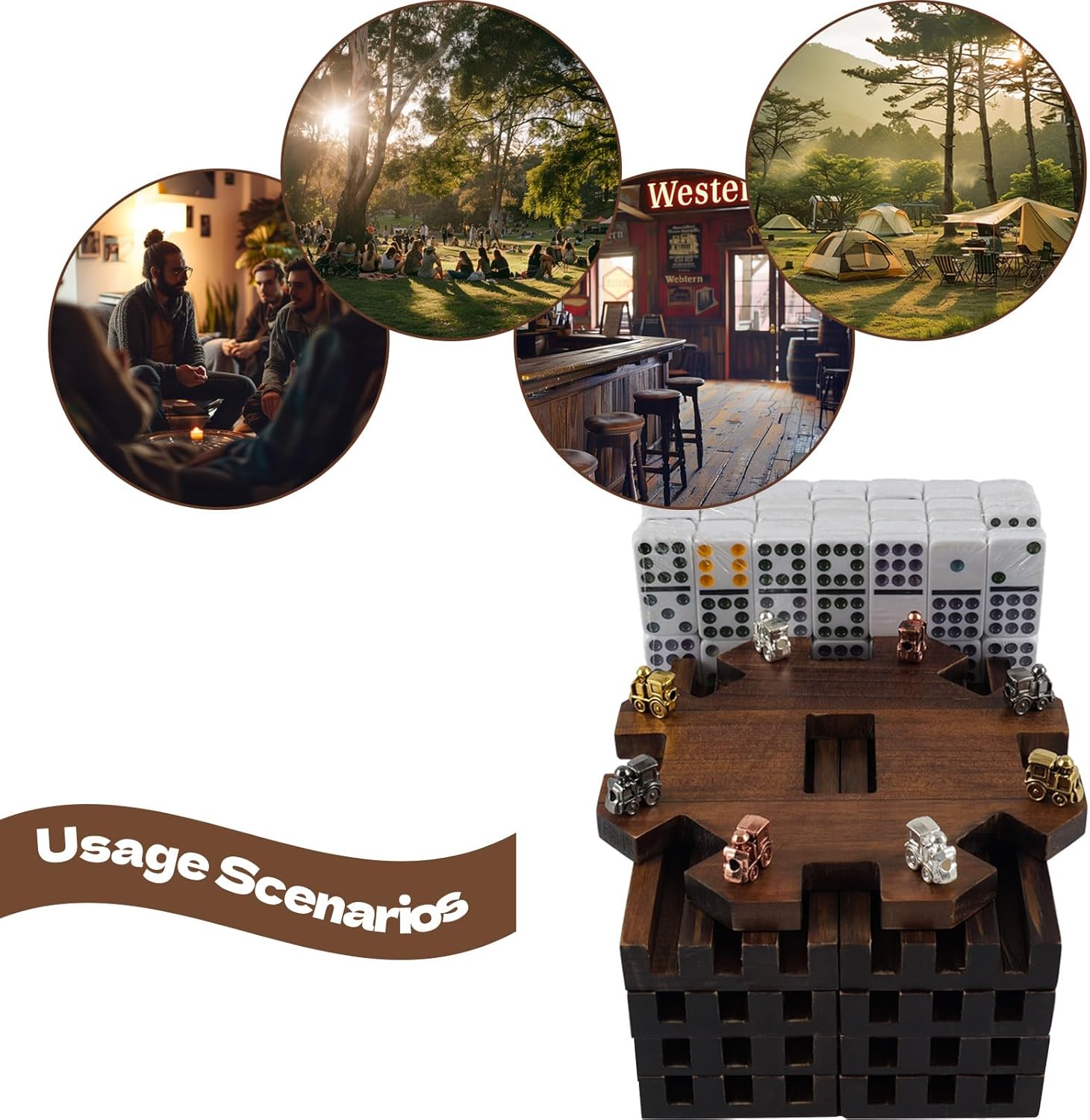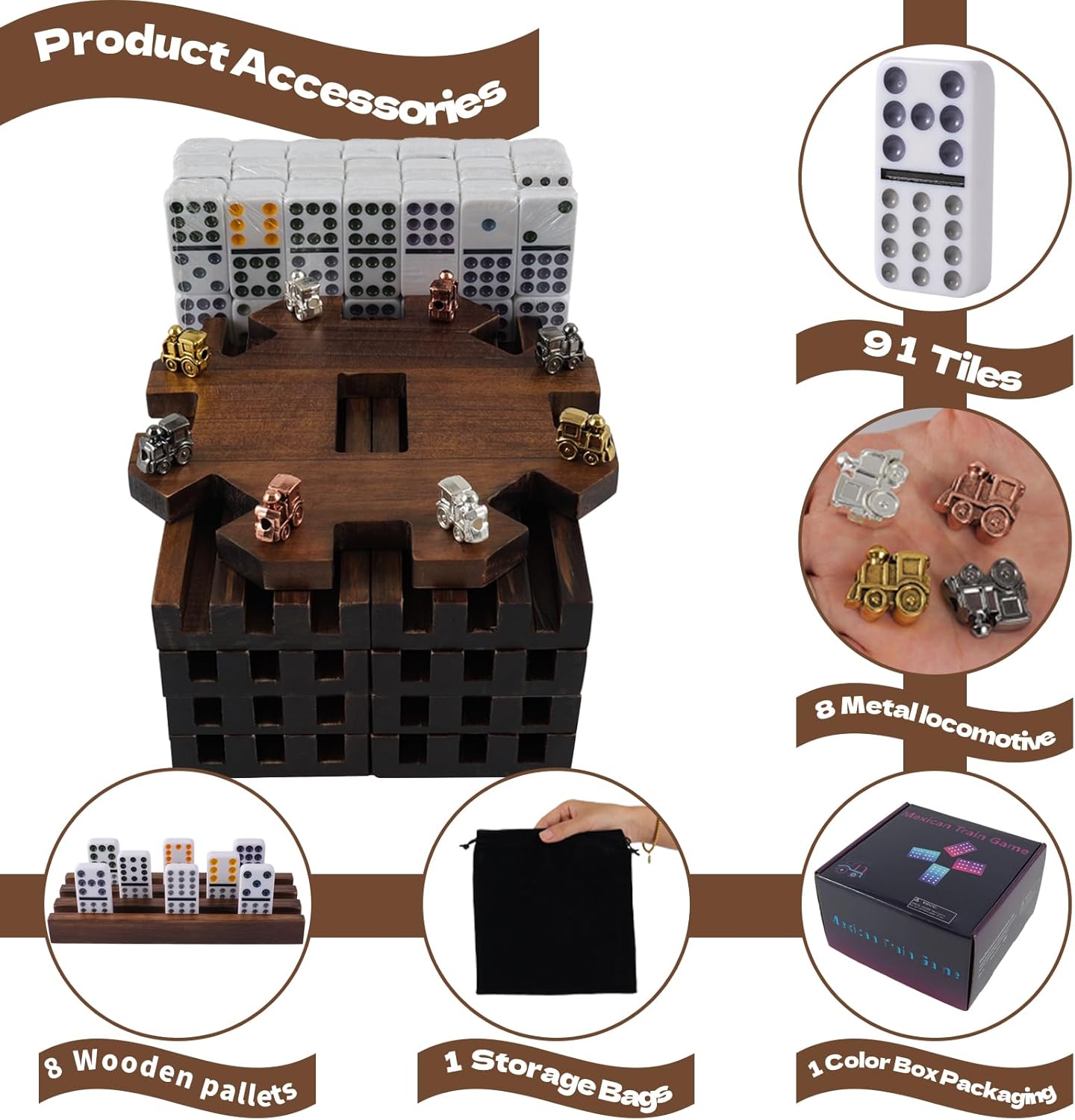 - 【Complete Double 12 Domino Set】Including 91 high-quality domino tiles (1.93 x 0.98 x 0.39 inches), 8 solid wood domino frames (7.09 x 2.76 x 0.79 inches), a rustic wooden wheel hub, and 8 metal train markers (0.79 ") in 4 distinct colors (2 each: Bright Silver/Rose Gold/Carbon Silver/Gold Colors) ,and domino storage bag and game instructions- all components are carefully crafted for an authentic Mexican train gaming experience.