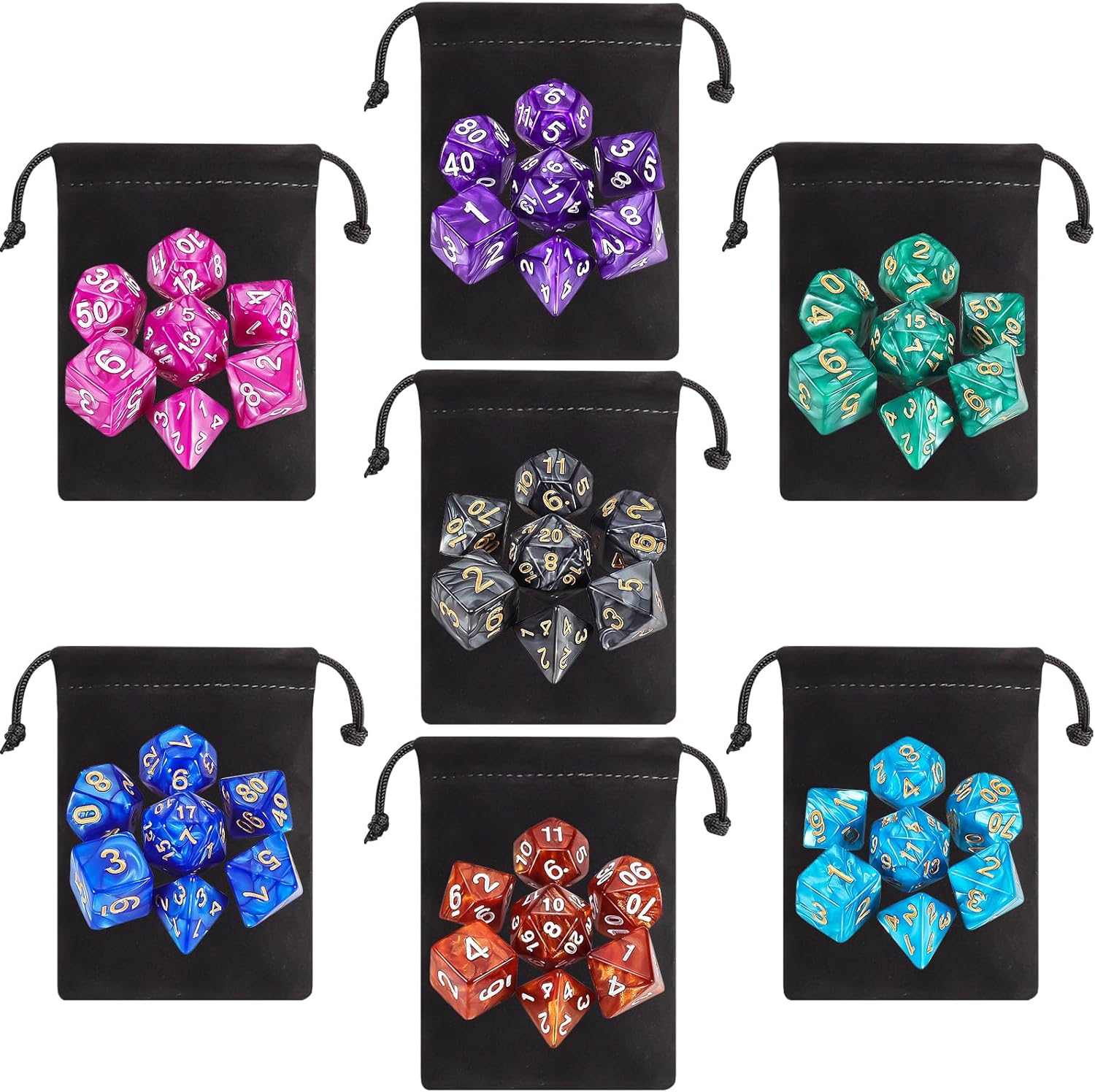 - DND Dice Set: DND Dice Set has 7 Set D&D dice sets ( 49pcs in Total ), 7 x Drawstring Bags. Each 7-die set contains 1 piece d20, 1 piece d12, 2 pieces d10 (00-90 and 0-9), 1 piece d8, 1 piece d6, 1 piece d4; 49 Pieces in total. Ideal for beginning players and more advanced ones.