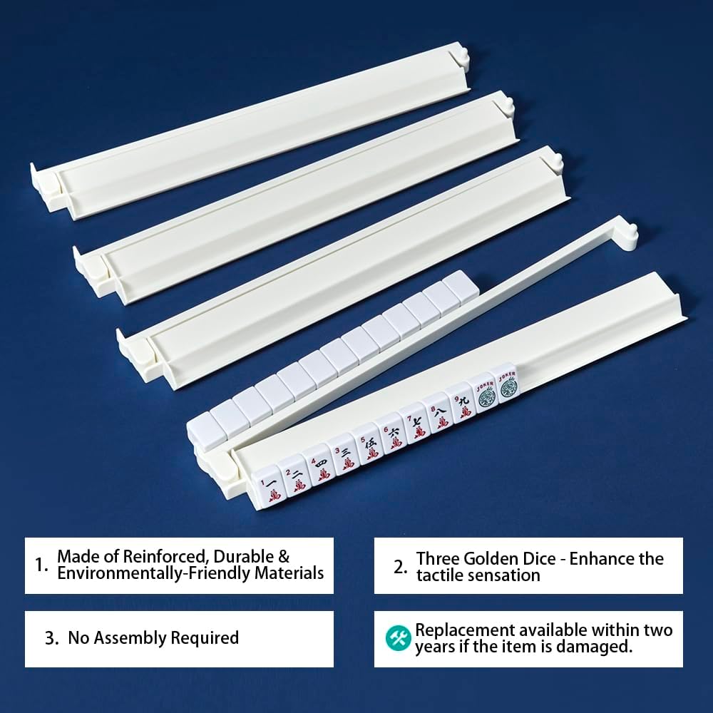 - All in One: Comes with 4 racks with built-in pushers, 3 weighted golden dic. Mahjong tiles are not included.
