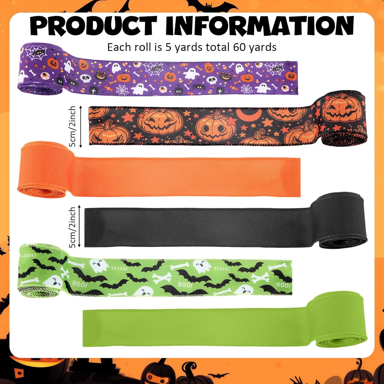 - Ample Quantity and Ideal Size: crafted to meet your decoration needs, our Halloween ribbon comes in a set of 12 rolls, providing ample supply for all your needs; Each roll is approximately 5 yards long and 2 inches wide, providing you with ample ribbon to create beautiful Halloween crafts and decorations