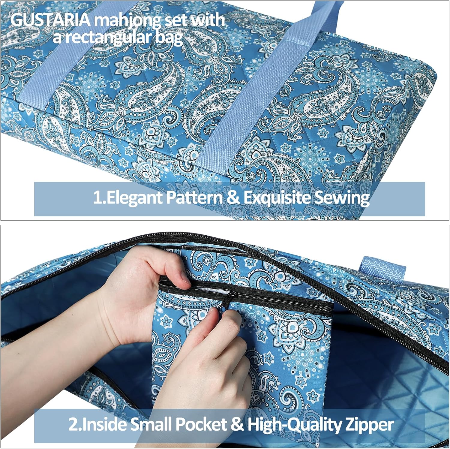 - LIGHT BLUE PRINTED CARRYING CASE: The American mahjong game set comes with a bag which has beautiful pattern on it, lightweight and resistant to tears, the portable case with a zippered top, inner pocket and convenient shoulder straps makes for a gorgeous set. A great game set for you to spend the pleasant leisure time with your families or friends.