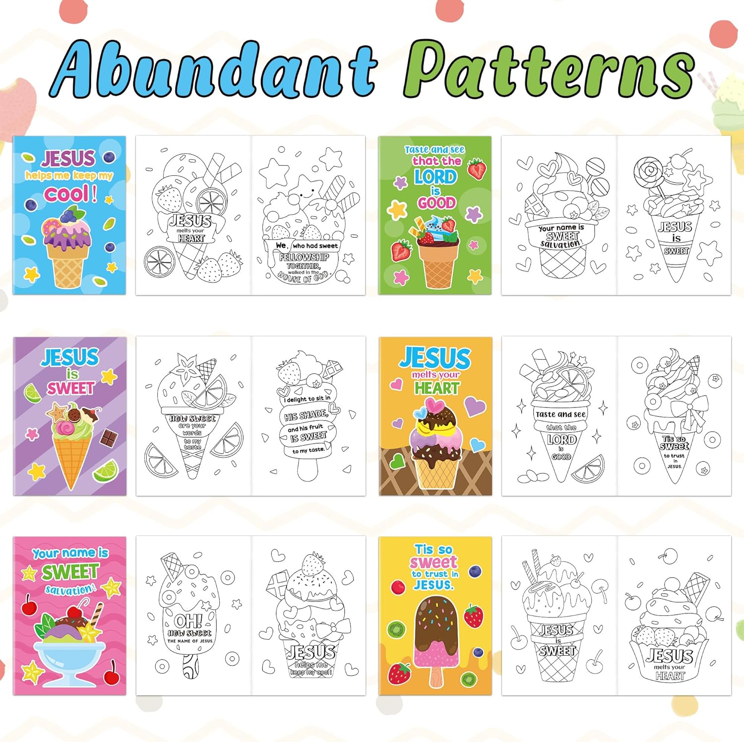 - Portable & Delicate Designed - Our religious themed coloring book measures approximately 4.9 x 6.9 inches / 17.5 x 12.5 cm, easy to carry. The inside of the coloring book is printed with different styles of ice cream on the front and back, it will add atmosphere to your summer.