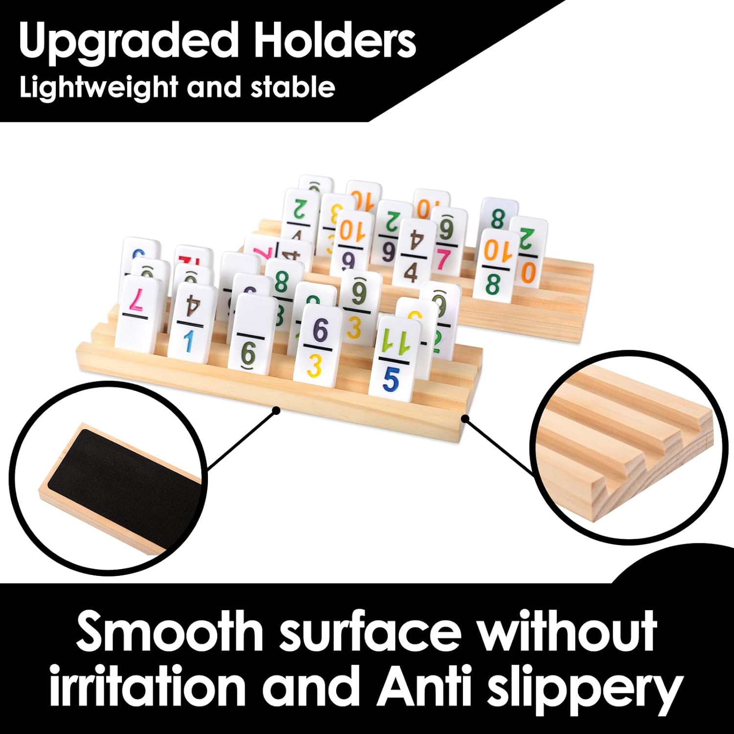- 8 Wooden Holders: This set includes 8 solid wood holders, each with 3 angled slots to securely hold domino tiles upright or sideways. Track your game layout effortlessly and plan your movesβno manual adjustments or tile concealment needed