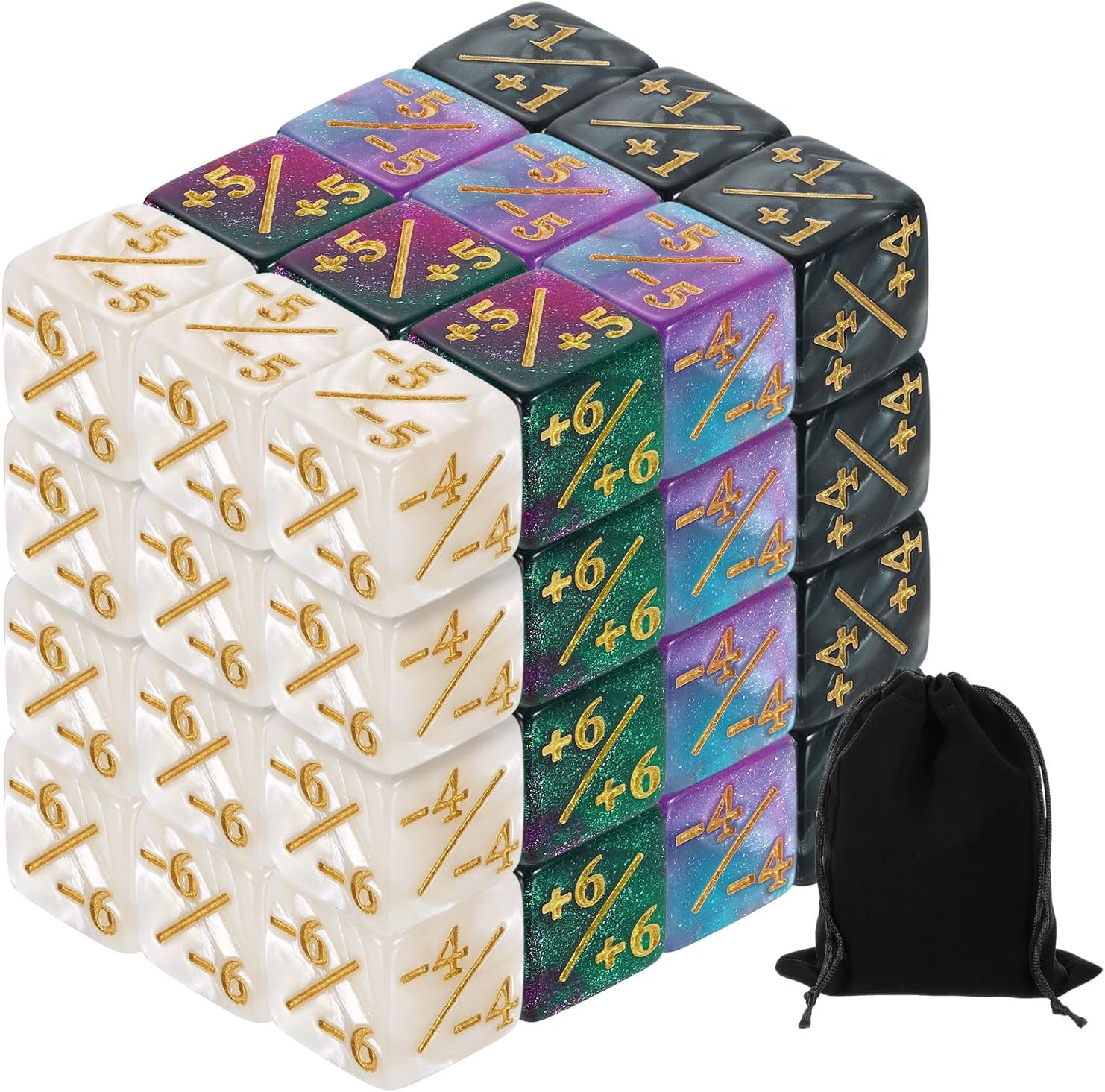- [Size & Package]: The package comes with 48 pcs of White Marble, Black Marble, Green & Purple, Blue & Purple (each color for 12 pcs) dice counters with 1 piece of dice pouch, measuring 16 x 16 x 16 mm (0.63 x 0.63 x 0.63 inches), which is the standard D6 size and has enough quantities for your daily game use and replacement