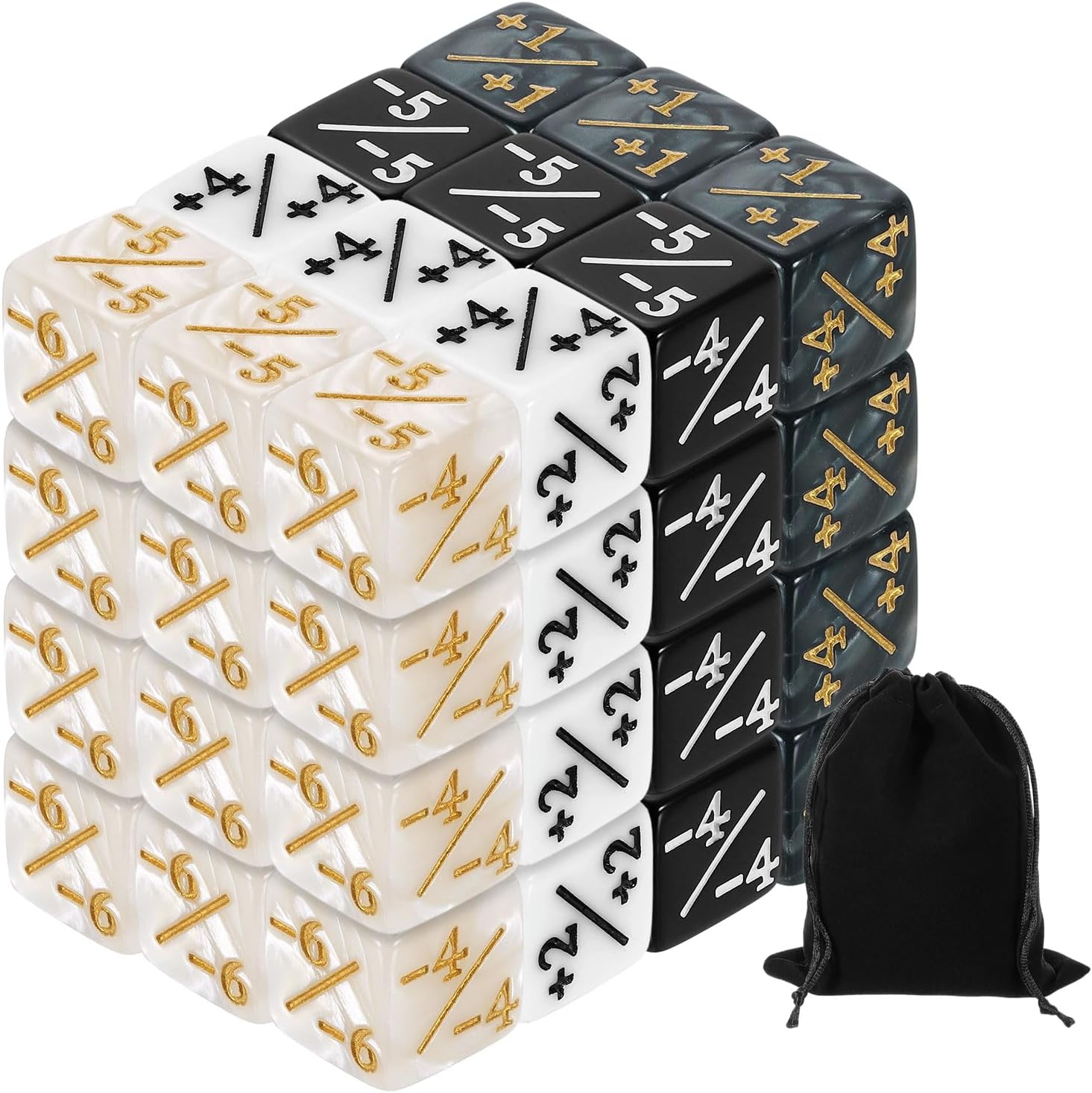 - [Size & Package]: The package comes with 48 pcs of White Marble, Black Marble, White, Black (each color for 12 pcs) dice counters with 1 piece of dice pouch, measuring 16 x 16 x 16 mm (0.63 x 0.63 x 0.63 inches), which is the standard D6 size and has enough quantities for your daily game use and replacement