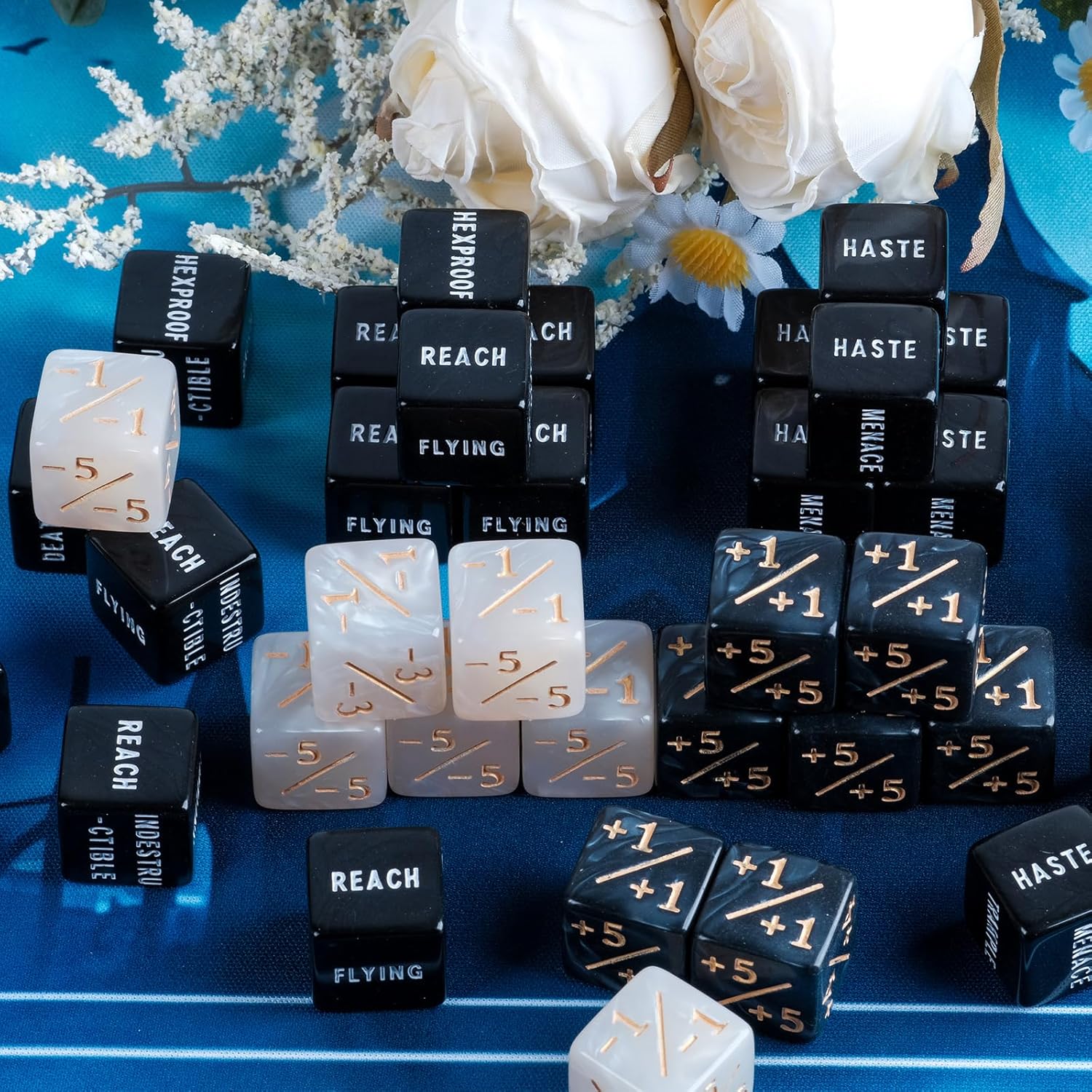 - 48-Piece Set to Meet Various Needs: Includes a wide range of MTG ability keyword counters, life counters, and 1/+1 counters with 6-sided dice, a one-stop solution for tabletop gaming, MTG, and TCG battles without the need to purchase additional accessories, making it the gamer's choice.
