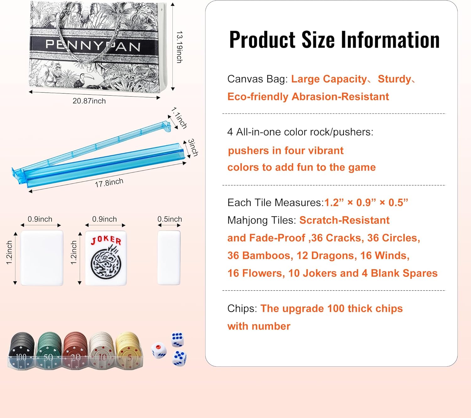 - Complete configuration:The American Mahjong Tile Set Includes 4 all-in-one pusher and rack .Each set also comes with 3 dice, 100 chips, 1 wind direction indicator , and a transparent mahjong teaching manual,It's very beginner friendly, equipped with everything,It's the beginner Mahjong Sets!