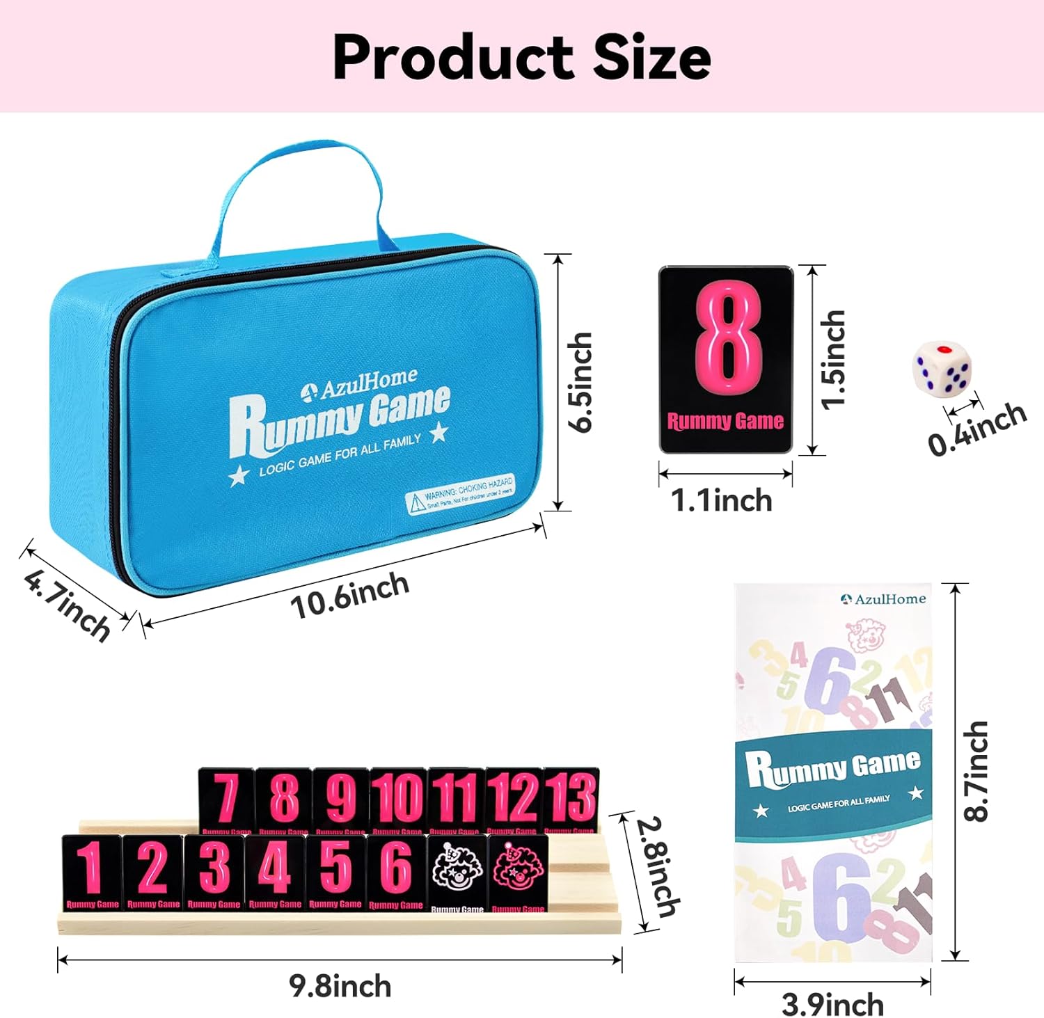 - All in One Rummy Cube Set: Rummy cube set 2-6 players edition comes with 160 rummy tiles (156 numbered tiles in four colors + 4 Jokers), 6 wooden racks, 1 zipper bag, 2 dice and 1 instruction. For 2-6 players. NOTE: THIS ITEM IS NOT INTENDED FOR USERS UNDER 8 YEARS OLD