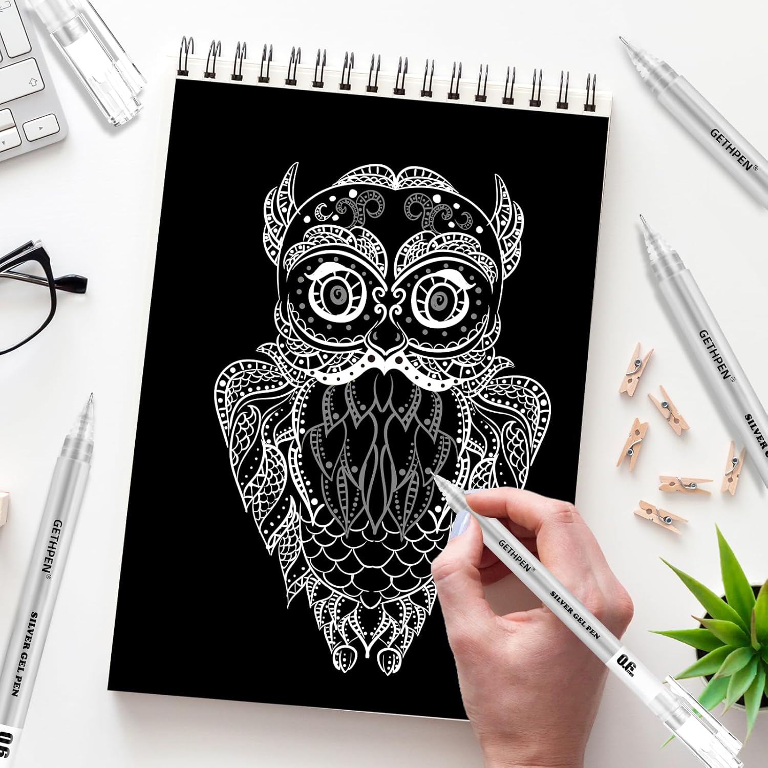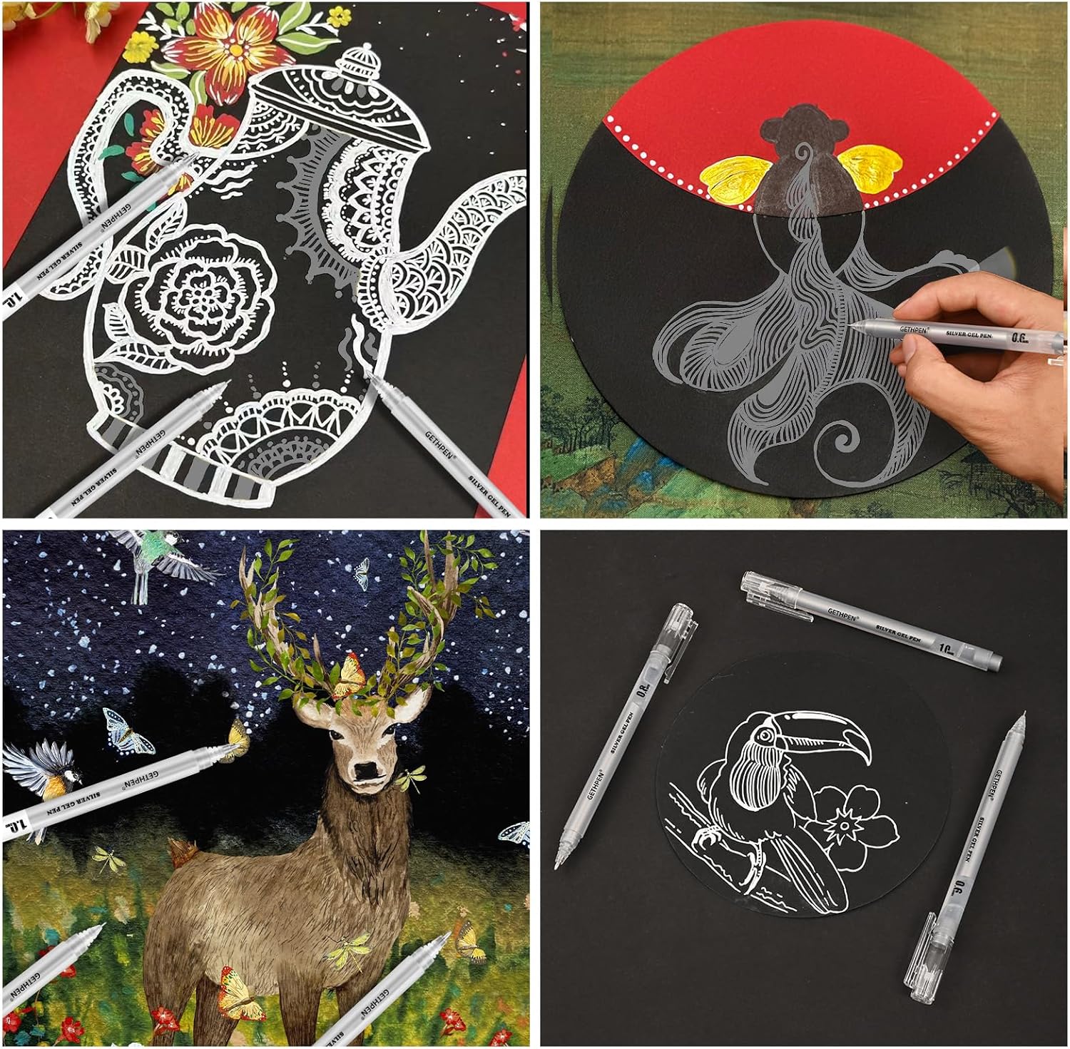 - Silver Gel Pens Set: 0.6mm for micro tech sketching, 0.8mm for sleek lettering, and 1.0mm for bold industrial art. The opaque silver ink creates luminous contrast on dark papers, perfect for Drawing, Sketching, Illustration