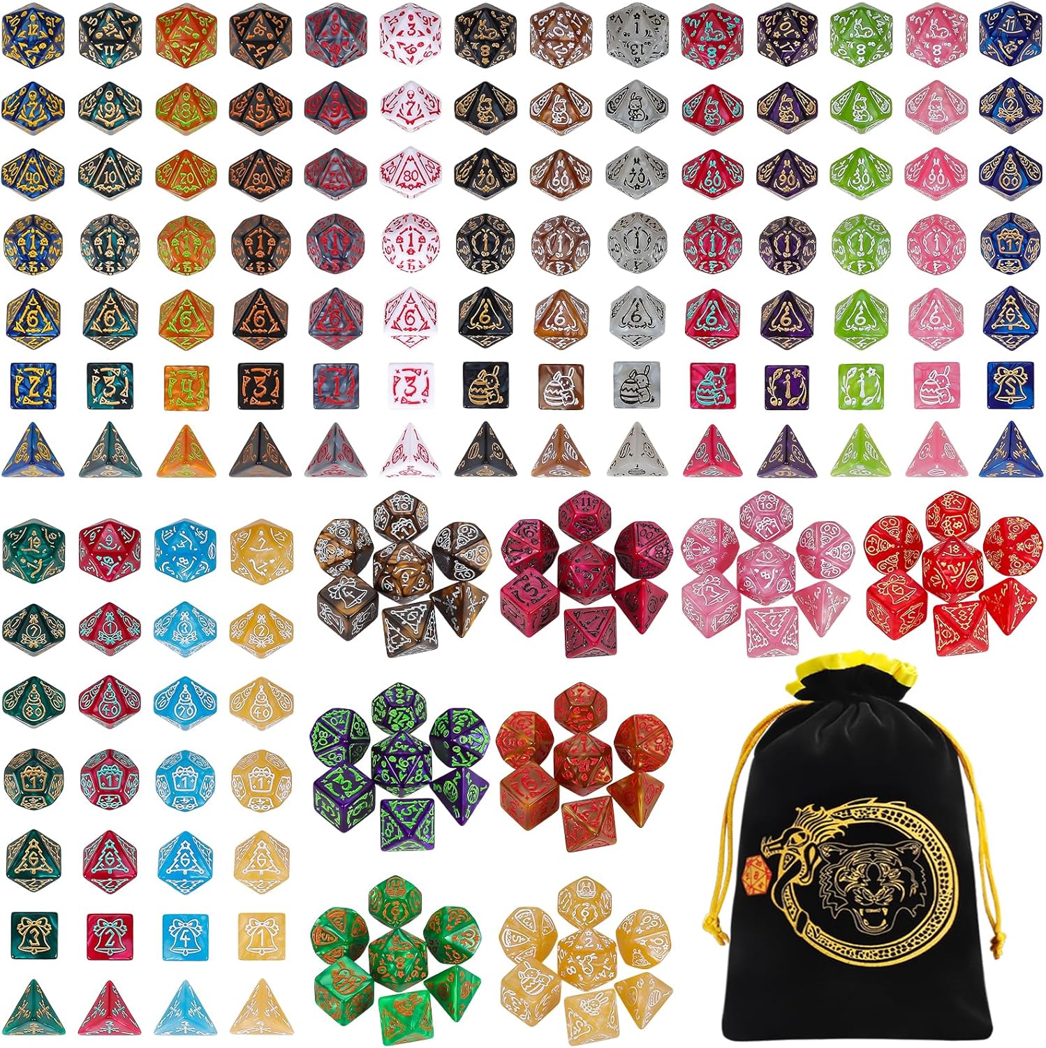 - COMPLETE SET: 182 polyhedral dice organized into 26 sets of 7 pieces each (d20, d12, d10, d8, d6, d4, and d%) with a large decorative drawstring storage bag for convenient organization.