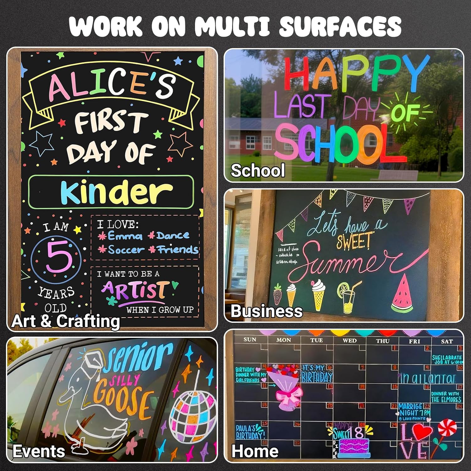- MULTI-SURFACE VERSATILITY: These fun chalkboard markers can be used on blackboards, first-day-of-school signs, car windows, glass, mirrors, labels, wedding event signage, weekly menu chalkboards, and bistro window art. Whether you’re decorating for the holidays, teaching a class, or promoting your business, this set of eight vibrant chalkboard markers offers unmatched versatility and ease of use.