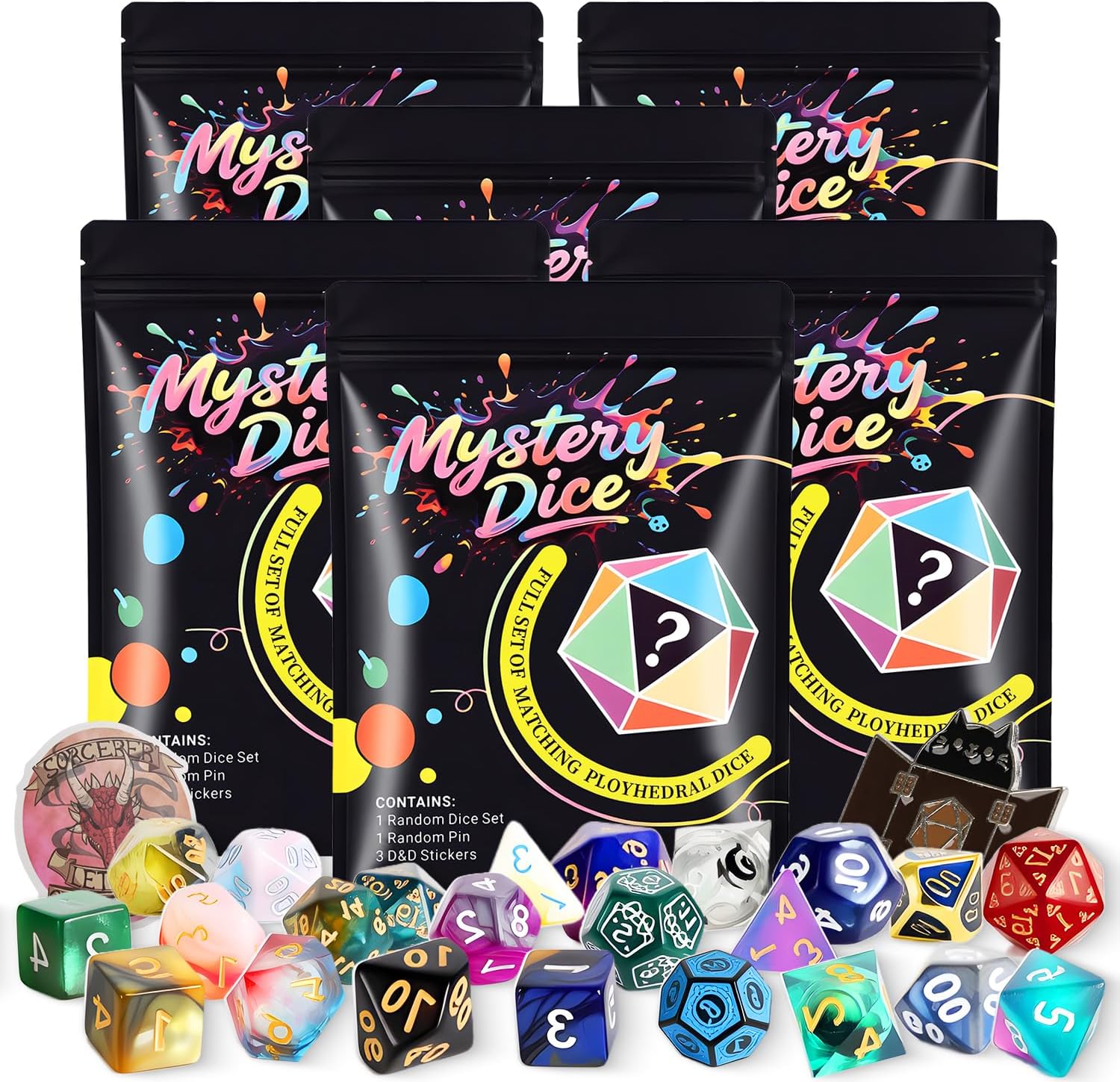 - Mystery Dice Set: 100+ stunning color and pattern combinations! Before opening the bag, you never know what amazing combination of dice you will discover. Give it a try and see what magical acrylic, metal, quicksand or filled resin dice you will get!