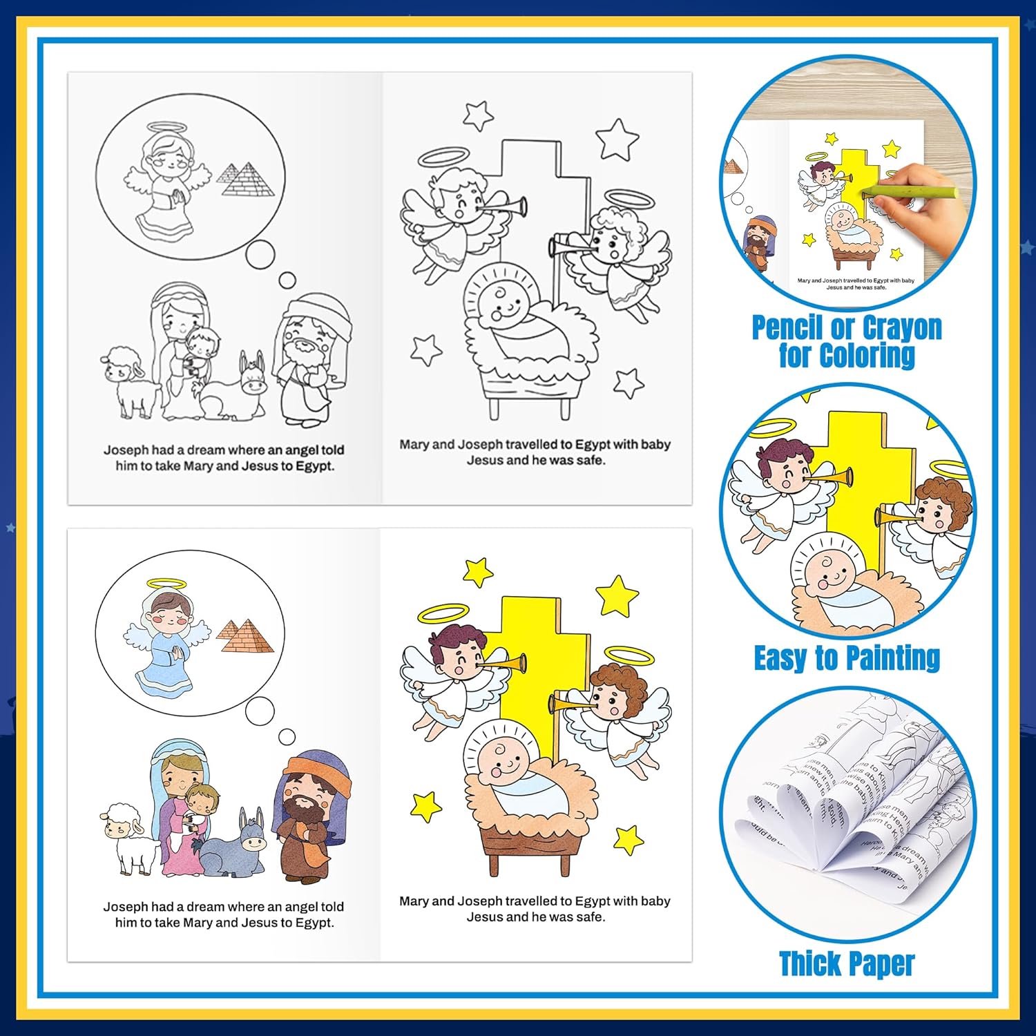 - Wide Application - These colouring books are suitable as gifts for kids' birthdays, Xmas holiday gifts, christian story activity, Christmas nativity activity, or as a work for DIY painting games or as a classroom reward. Whether it's between friends, classmates or parent-child activities it can be used as a bonding aid to draw and communicate together.