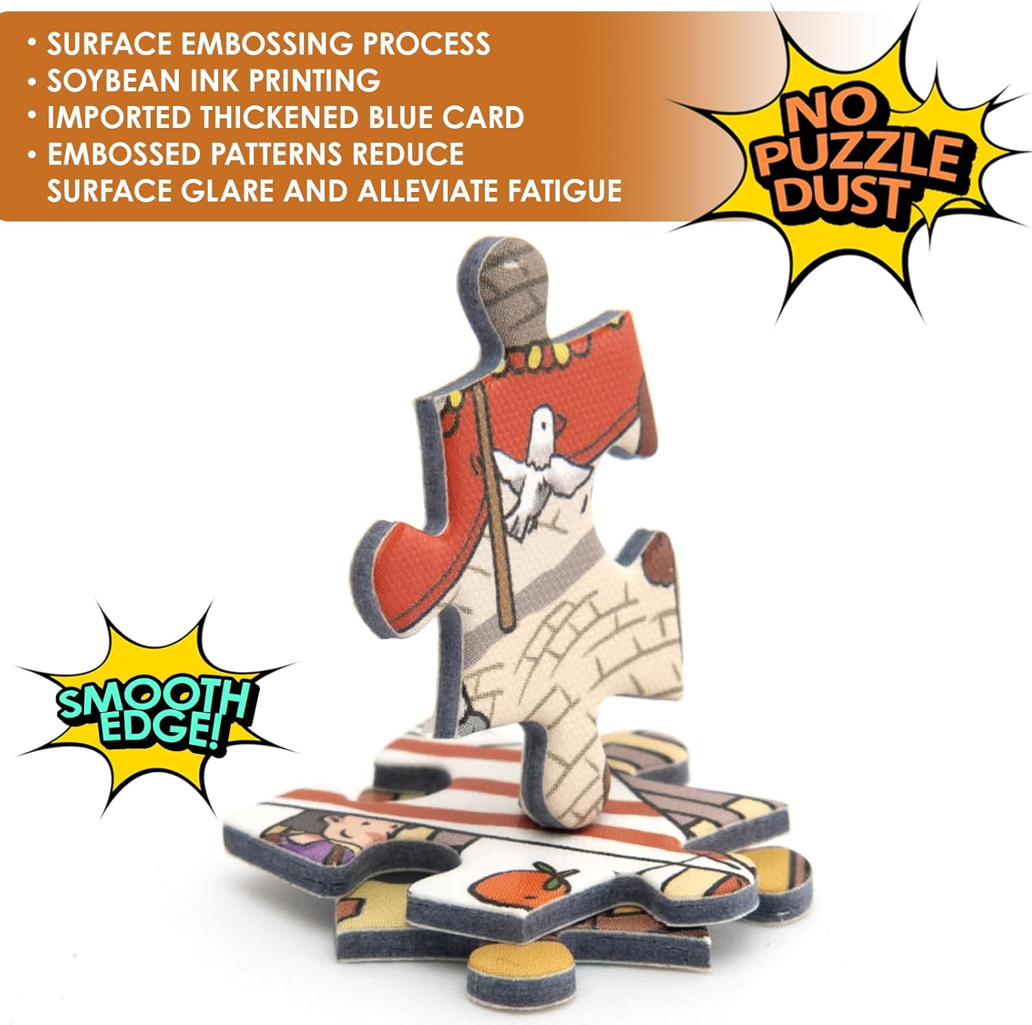 - Material & Craftsmanship: Imported professional blue card material cardboard, stiff & textured. Printed with soybean ink, safe, heat-resistant & friction-resistant. The surface of jigsaw puzzles for adults is embossed. The pattern does not easily fall off and is more textured. The double-sided paper mounting process increases the hardness by 15%. A single-piece puzzle is 2.6*2.6cm (1"x1"). The thickness is about 0.3cm (0.12"), which can be easily picked up by the elderly