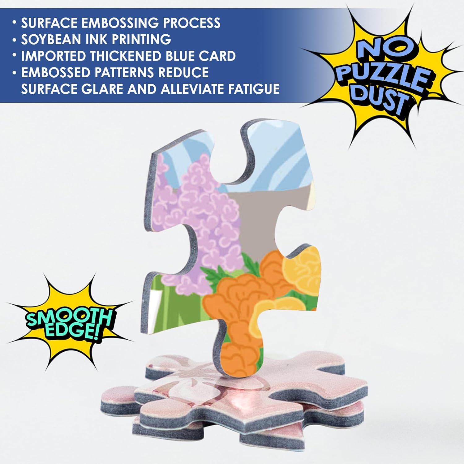 - Material & Craftsmanship: Imported professional blue card material cardboard, stiff & textured. Printed with soybean ink, safe, heat-resistant & friction-resistant. The surface of jigsaw puzzles for adults is embossed. The pattern does not easily fall off and is more textured. The double-sided paper mounting process increases the hardness by 15%. A single-piece puzzle is 2.6*2.6cm (1"x1"). The thickness is about 0.3cm (0.12"), which can be easily picked up by the elderly