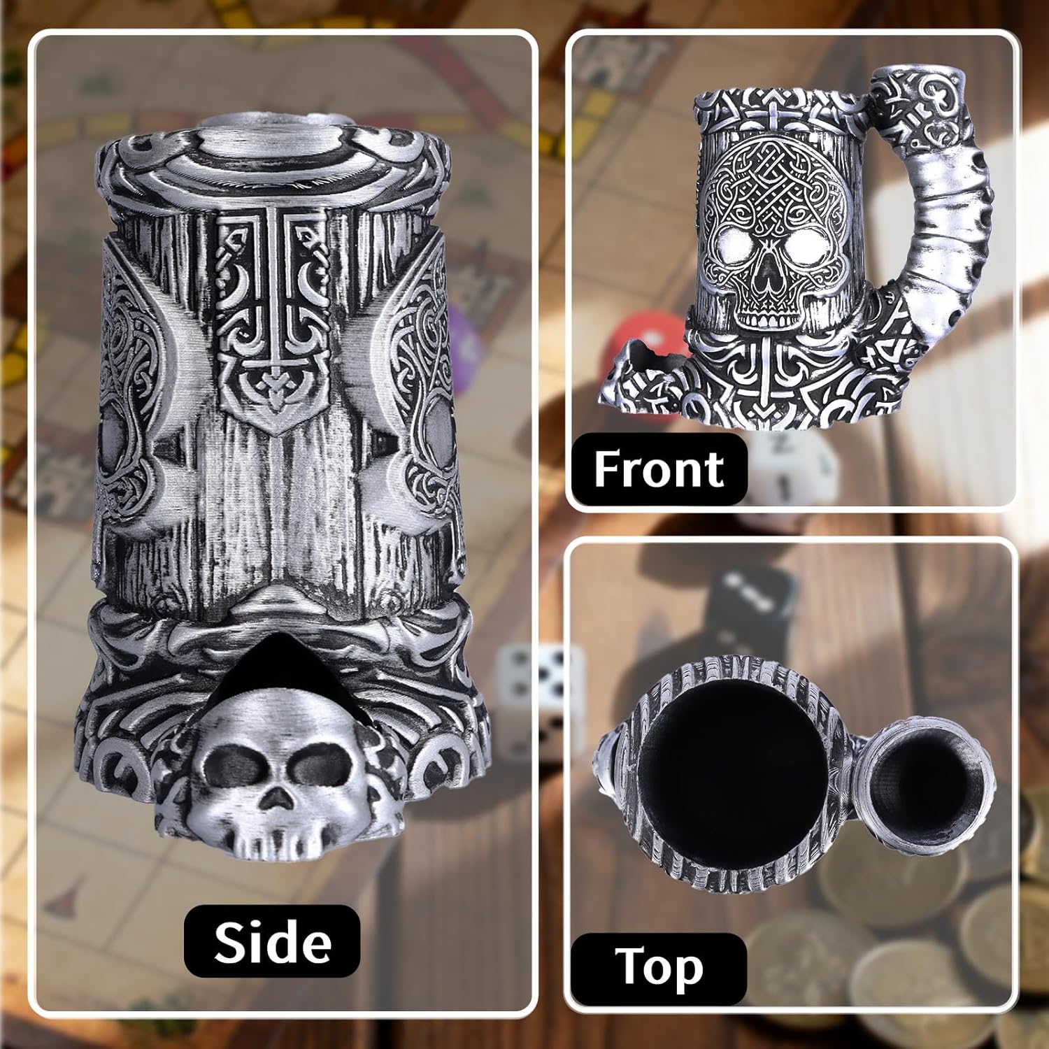 Dice Tower Mug, Dice Rolling Tower, Comes with 7 PCS Dice Set, Suitable for DND Dungeons and Dragons, Tabletop Games, Available As Drink Holder, D&D Gifts, DND Accessories (Silver Skull)
